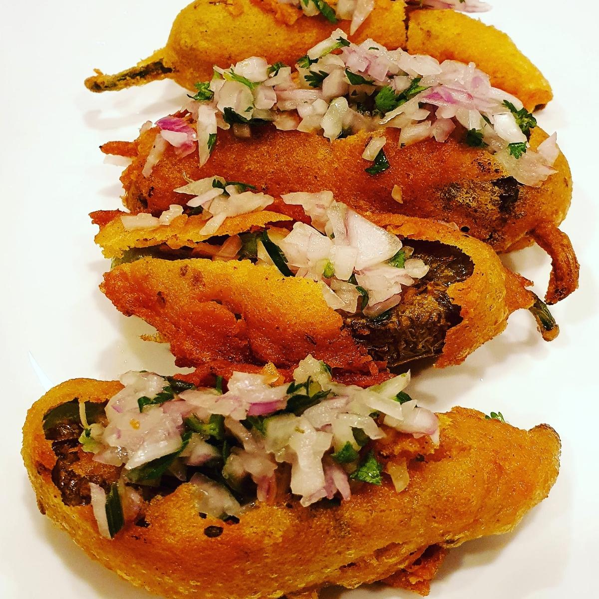 A timepass Snack that will be remembered. It is a traditional Andhra Dish Made out of Indian Jalapeños, Garnished and filled with Onions, Lemon, rawMango poweder.