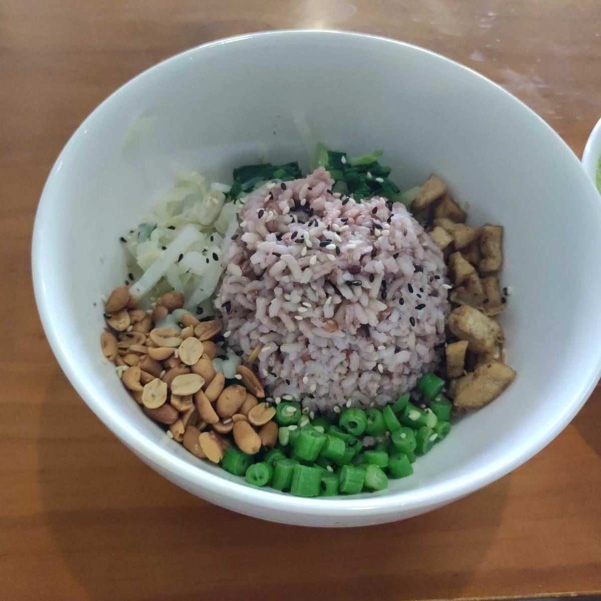 Authentic taste of a vegetarian thunder tea rice. Fresh ingredient, Green tea soup, diced bean curd, thinly cut legumes, peanut and black sesame, leafy vegetables make a nutritious combination for strengthening ones immune system