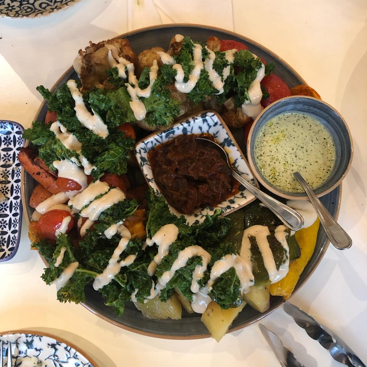 Under the bed of kale is an assortment of grilled zucchini, capsicum, carrots, tomatoes, pumpkin, potato, sweet potato and cauliflower. Went amazingly well with the two sauces - one was a tomato and olive based sauce and the other was a more fresh minty sauce. This dish is a testament to how amazing vegetables can be as they are. The whole table loved it and I highly recommend to anyone, vegan or not.