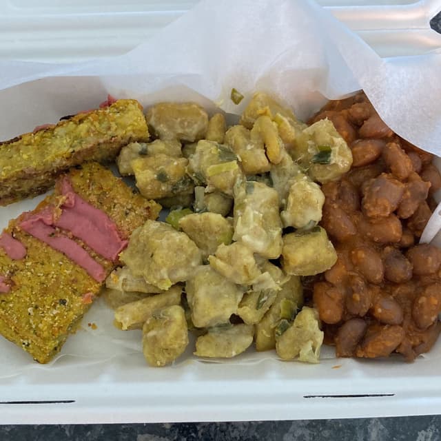 Tortino di tempeh con hummus di barbabietola, gnocchi di patate con crema al limone e fagioli borlotti in umido con salsa di pomodoro fresco. Tutto biologico