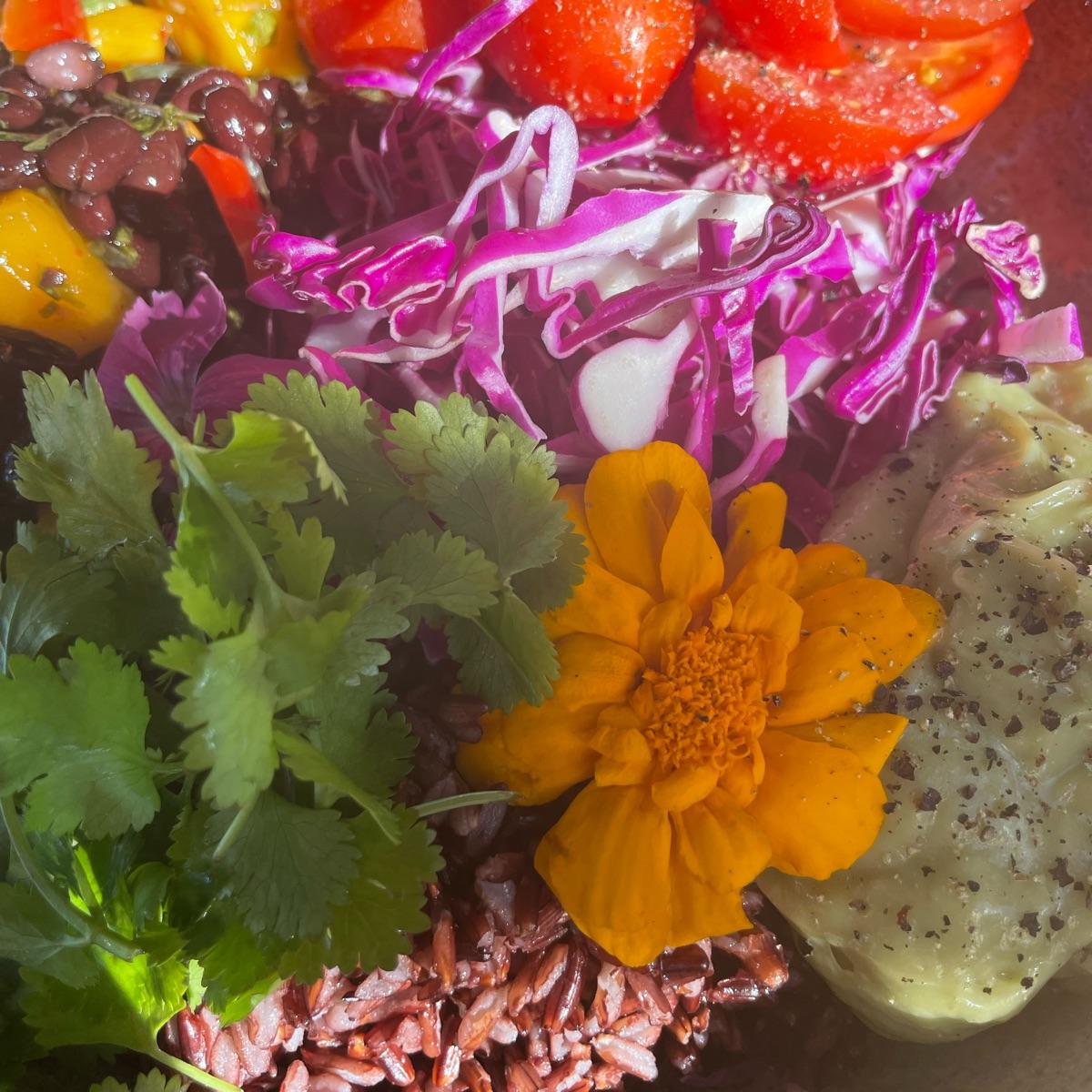 The completion of this dish is fresh and tasty - with ingredients like black rice, black beans and mango to blend flavours well