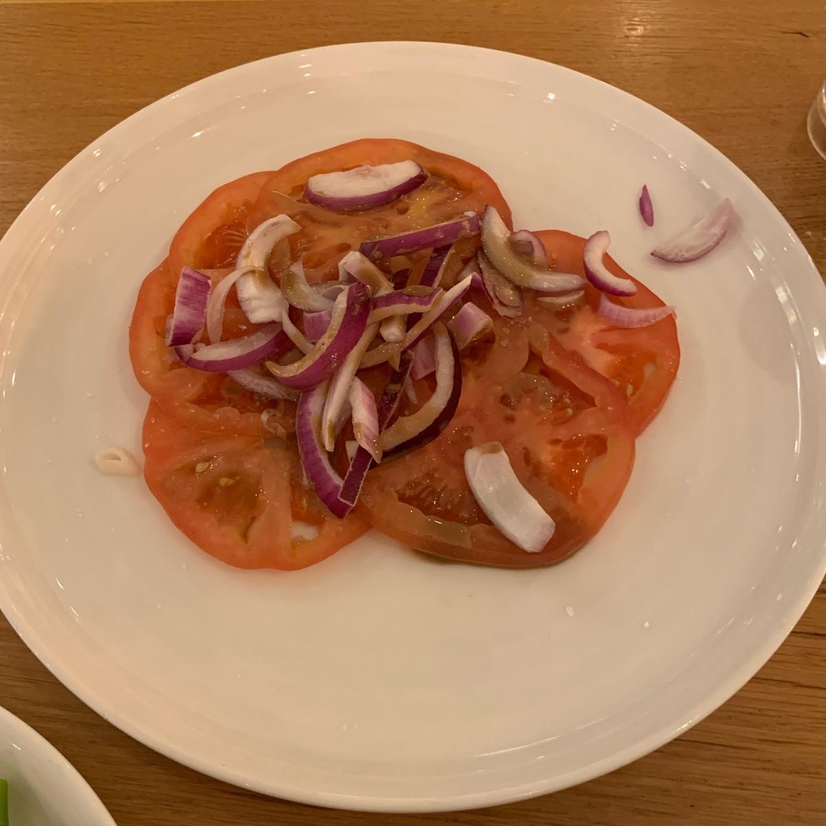Tomato with red onion with of balsamic dressing. Very good and filling.(tomatoes are pretty big)