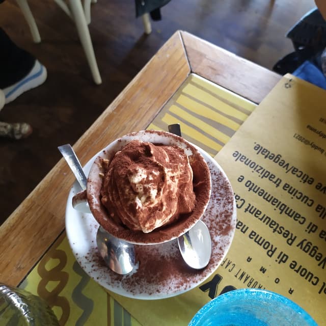 Locale fantastico in pieno centro aperto dalla mattina a sera tardi con tantissima scelta anche molto carino e accogliente. Questo tiramisù non mi ha entusiasmato troppo pannoso per i miei gusti, però molto buono. Hanno utilizzato anche dei biscotti neri tipo Oreo