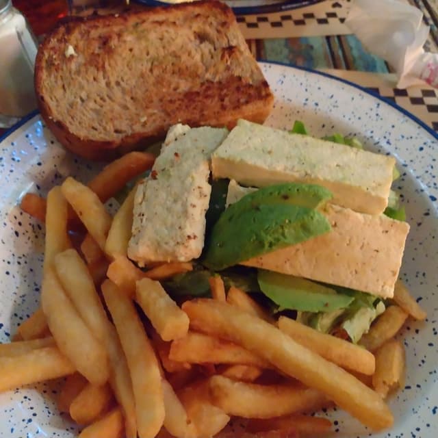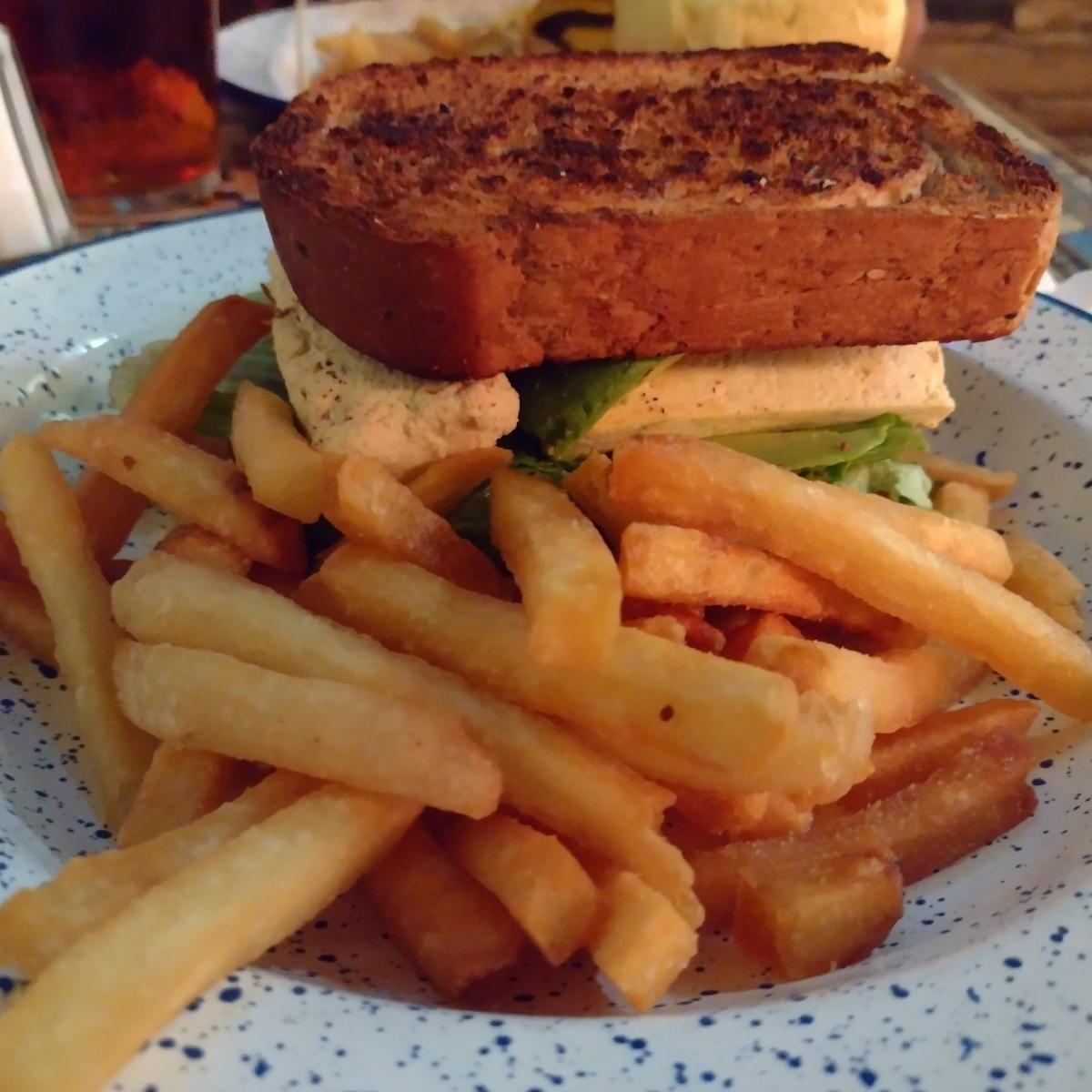 El pan era rico, las papas estaban bien, pero el tofu no estaba condimentado, entonces era un sándwich soso, sin onda.