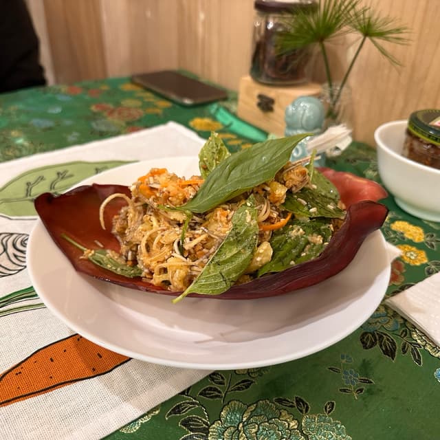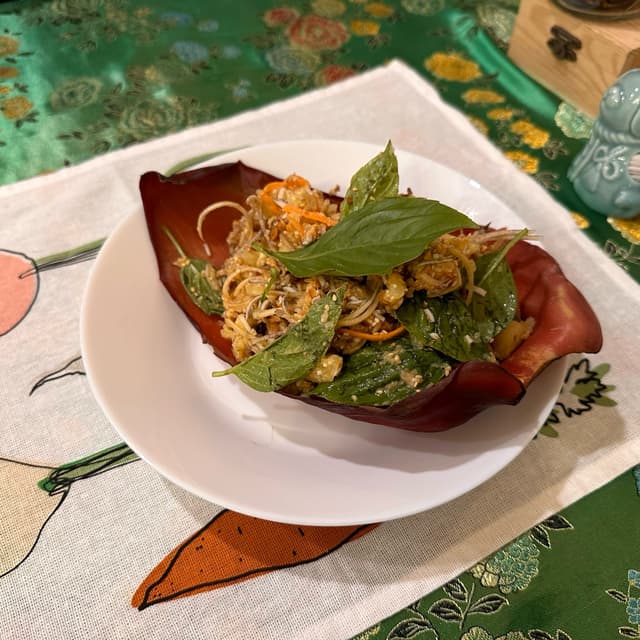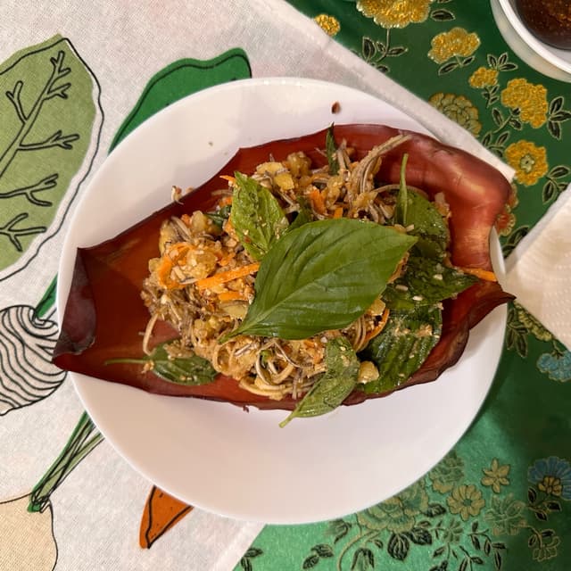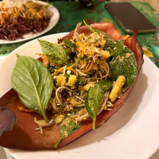 Banana blossom, served in a #bananablossom petal 🍌 The #salad is the banana heart foremost, but more so than incredibly minty and lime forward. There were also these lovely carrot strips, which in hindsight may have actually been papaya 🥕