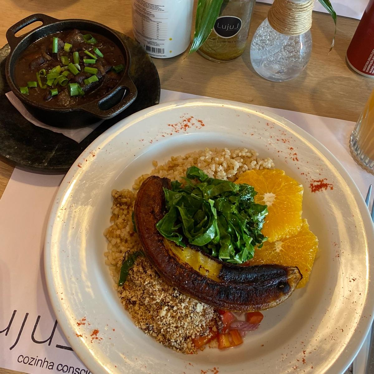 Feijoada vegana com legumes, acompanha arroz, farofa, banana da terra, couve, vinagrete e laranja. Achei bem servida e muitooo saborosa, o ambiente é bem aconchegante.