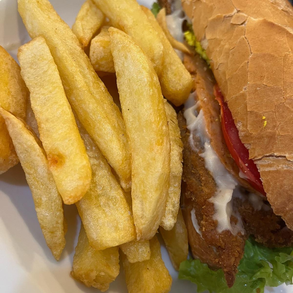 Lomito rebozado con lechuga, tomate, jamón, queso y huevo. Potencia total con las papas que abundan. $9900 que lo vale