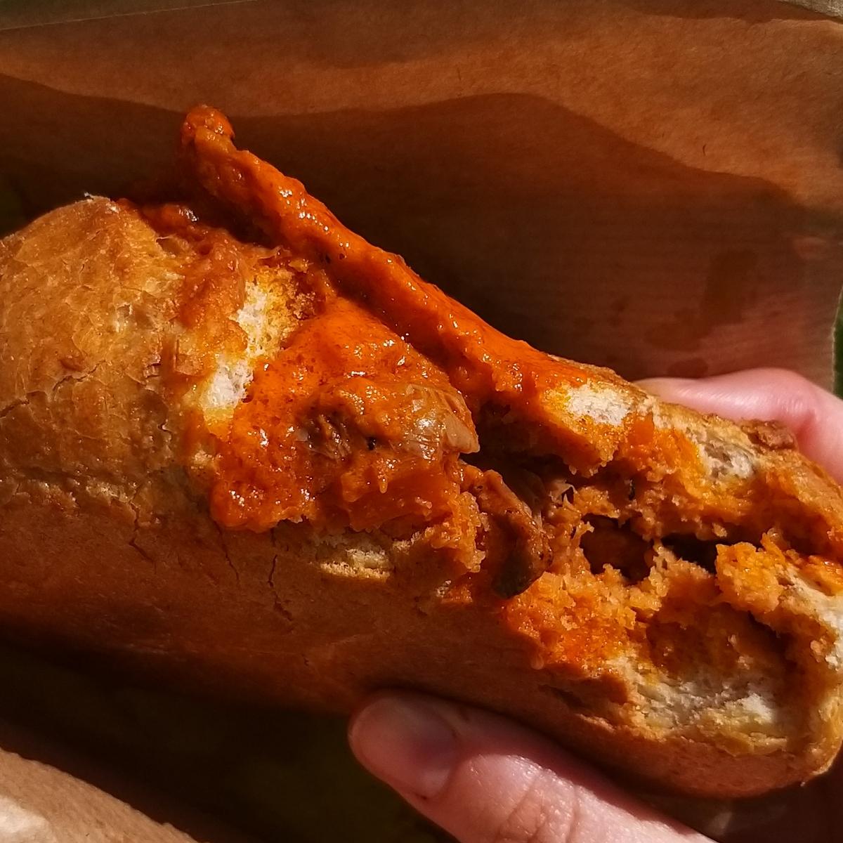 Panino con la trippa al sugo vegana. Nonostante i tentativi della nonna, non sono mai riuscita a mangiare la trippa originale perché ne odiavo la consistenza. Qui si è risolto il problema perché il sugo è buonissimo e i funghi sono morbidi e carnosi 😍