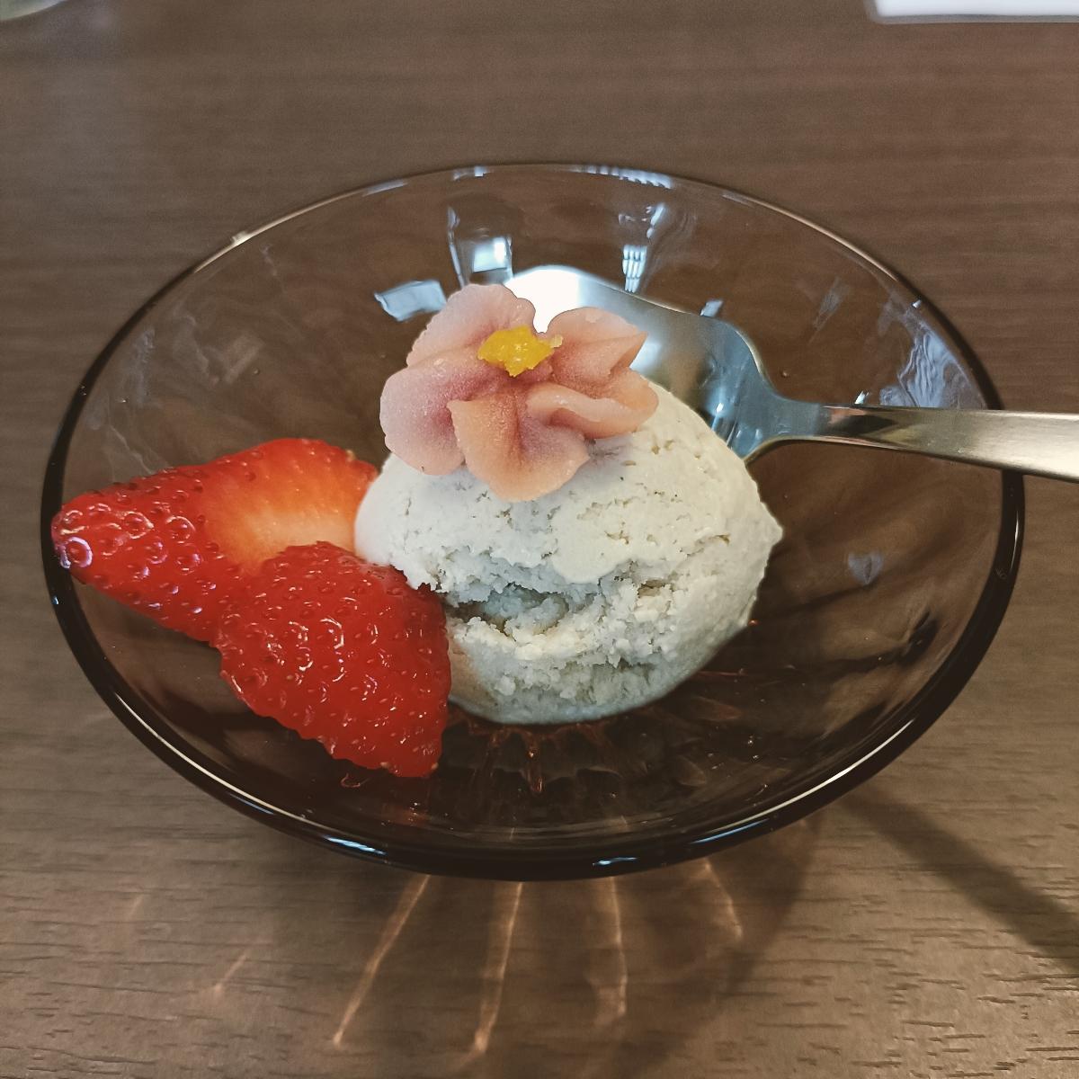 Dessert compreso nel menu completo: gelato vegetale con frutta fresca. Buono ma sempre porzione scarsa e prezzo alto