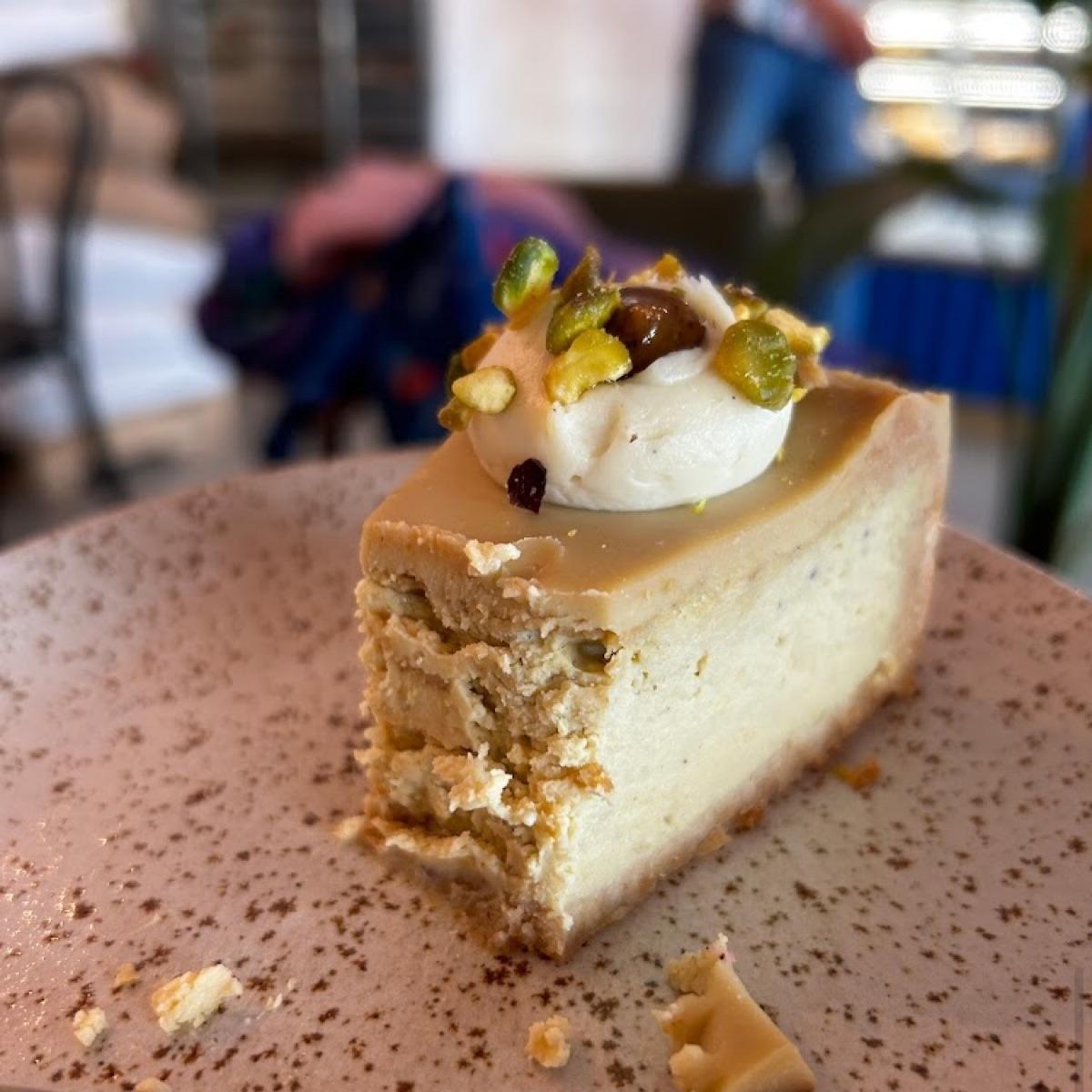 It’s smooth and creamy. The shortbread base provides a perfect foundation for the rich, velvety cheesecake filling. On top of this sits a thin layer of decadent light #caramel. A dollop of creamy vegan #creamcheese adds a touch of indulgence, while a single dot of caramel sauce inside the cream cheese adds a burst of sweetness. To finish, a sprinkling of chopped #pistachios adds a crunchy contrast, elevating each bite with a burst of nutty flavor #sweettooth