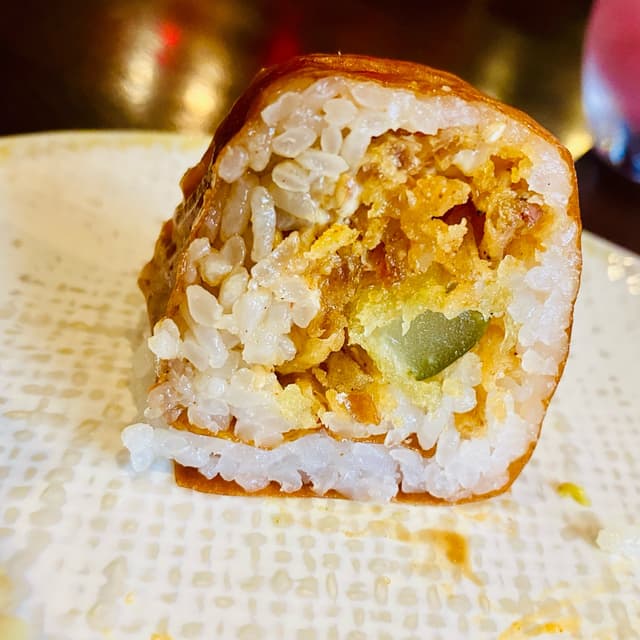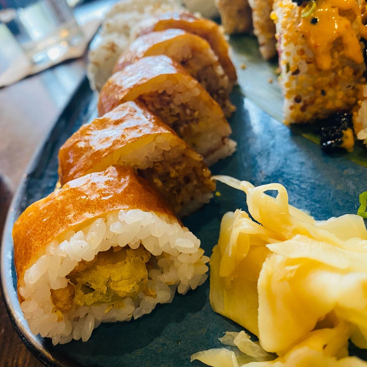 A tempura fried pickle??!! This was such a wild sushi roll but somehow ended up being one of my favorites. If it had a little bit of vegan ground beef it would almost be like a burger! It has a tempura pickle, fried onions, and bbq “skin” on the outside (seemed like tofu skin marinated in bbq flavors). Very interesting flavor combinations for a sushi roll and far from traditional sushi but I loved it.