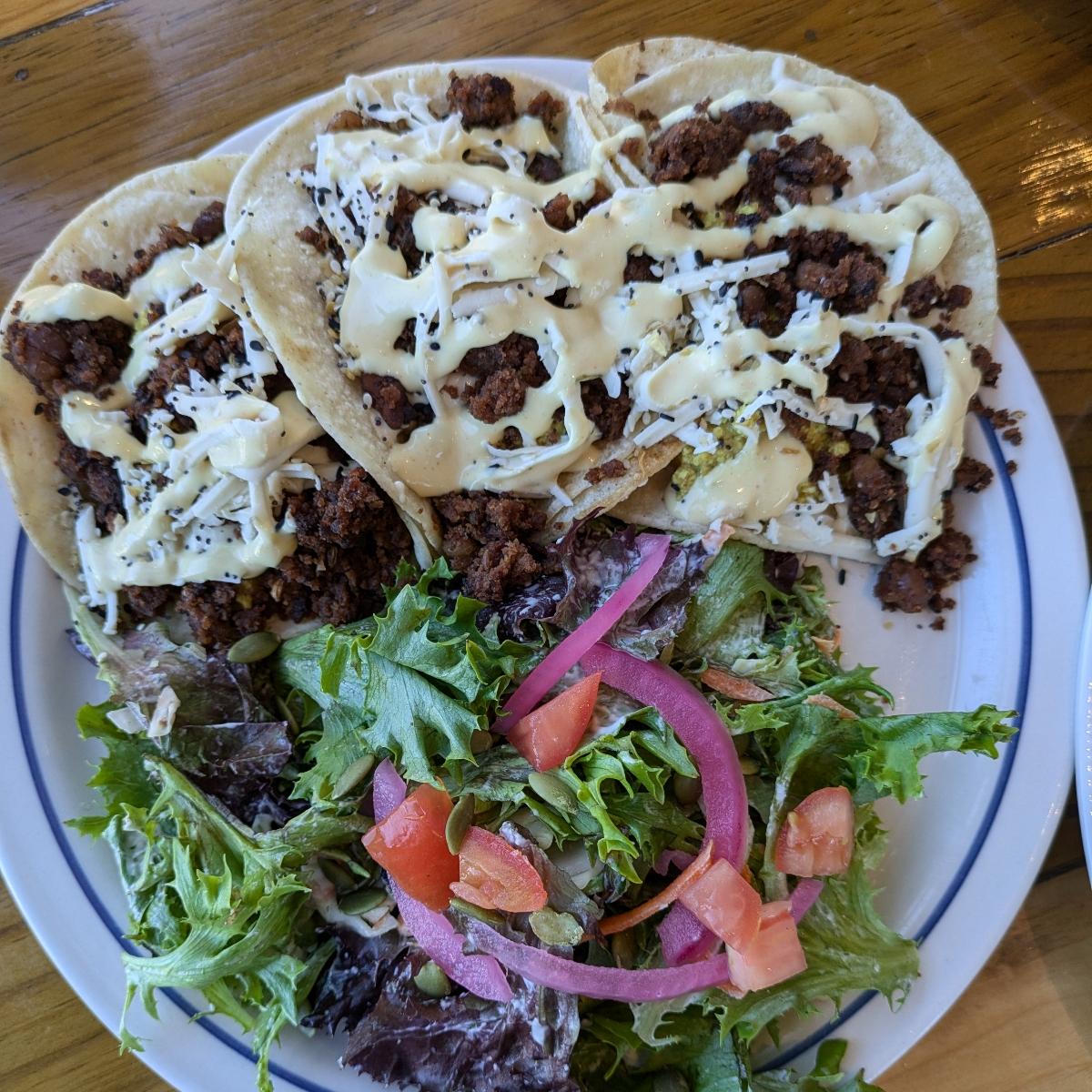 From the description: "Scramble, walnut sausage, cream cheeze, shredded cheeze, scallions, everything bagel seasoning, and aioli on corn tortillas"