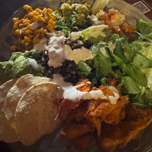 My fav out of the 3 dishes ordered. It has a good mix of everything and I think the lion mane mushroom is of great texture and well seasoned. Nothing to pick on—fresh greens, crispy corn chips that went well with the guacamole too!