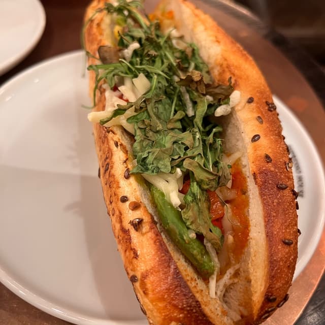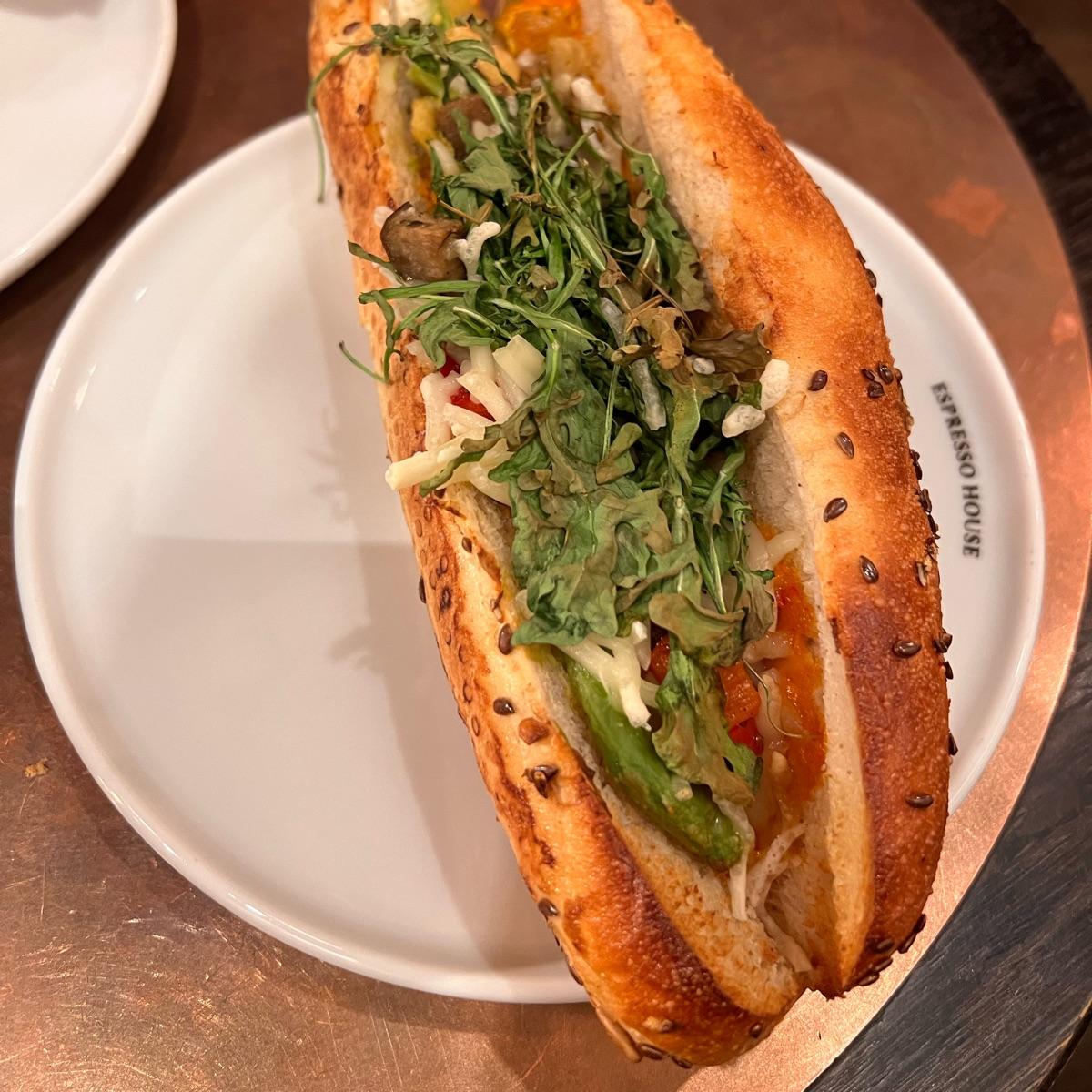 🇬🇧 Vegan sandwich with avocado, pepper cream, arugula ,eggplant (in oil) and vegan cheese: The Danes definitely have a different palate from ours, so this hodgepodge of ingredients had a decidedly bizarre taste, but it was late and they hadn't found any other food 😹 they served it to me warm (poor arugula)
