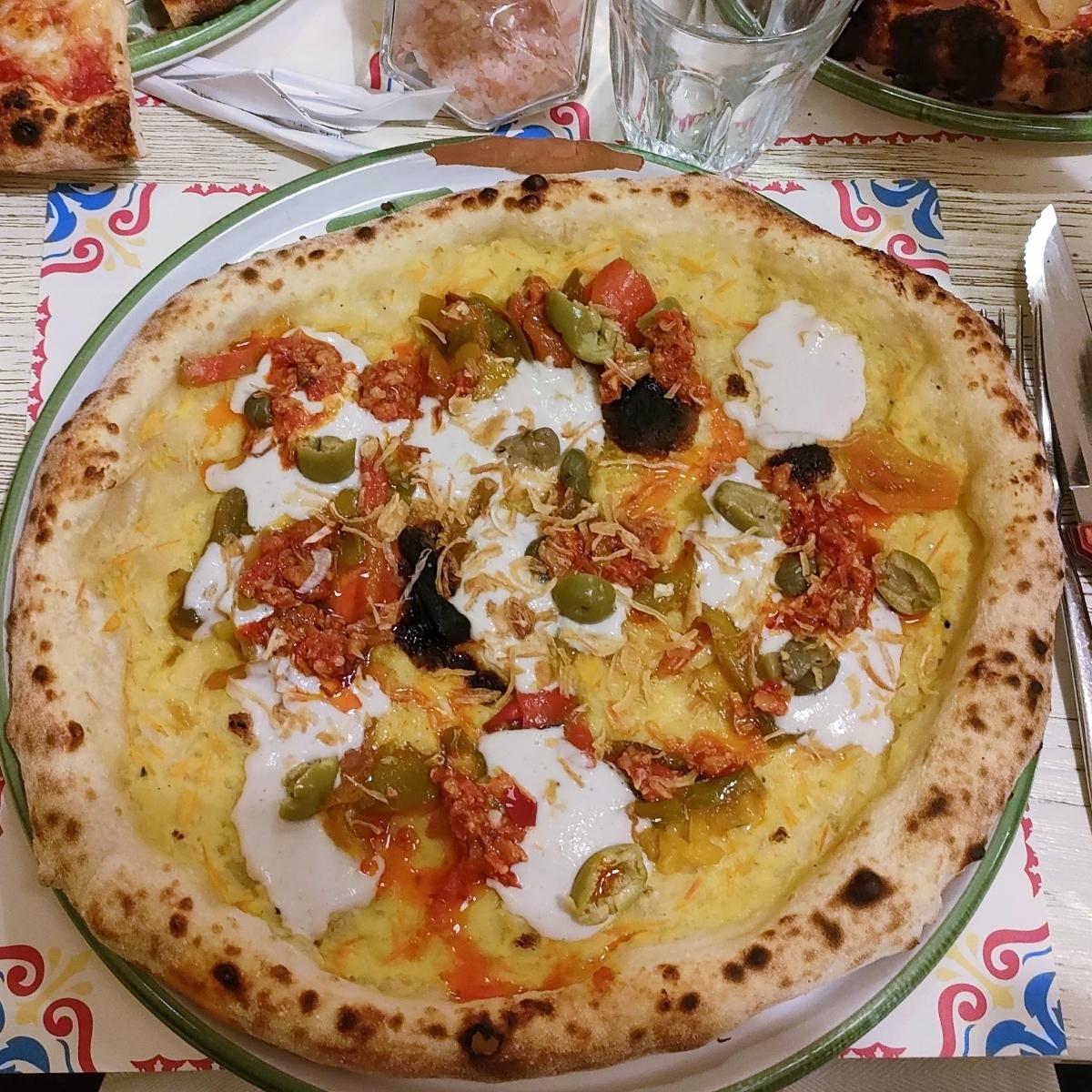 Con passata di datterini gialli,peperoni, melanzane(nel mio caso erano purtroppo finite),cipolla rossa,bomba calabrese,olive verdi e capperi. Io ho fatto aggiungere la mozzarella vegan,che ci stava molto bene a mio parere e consiglio.