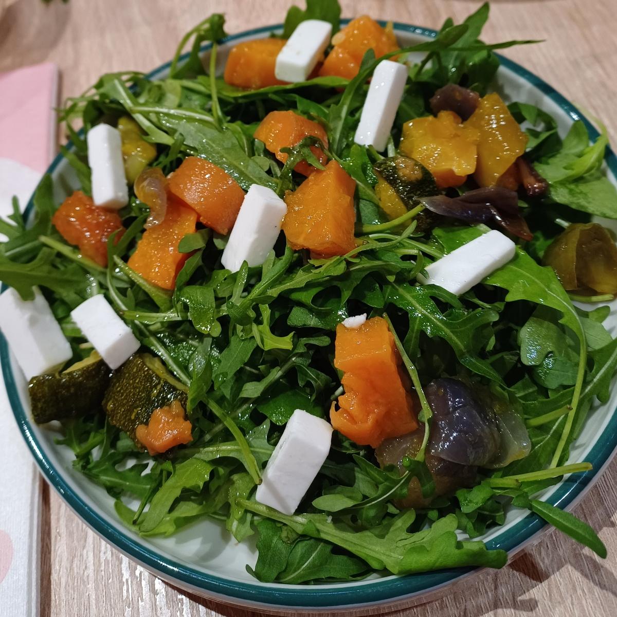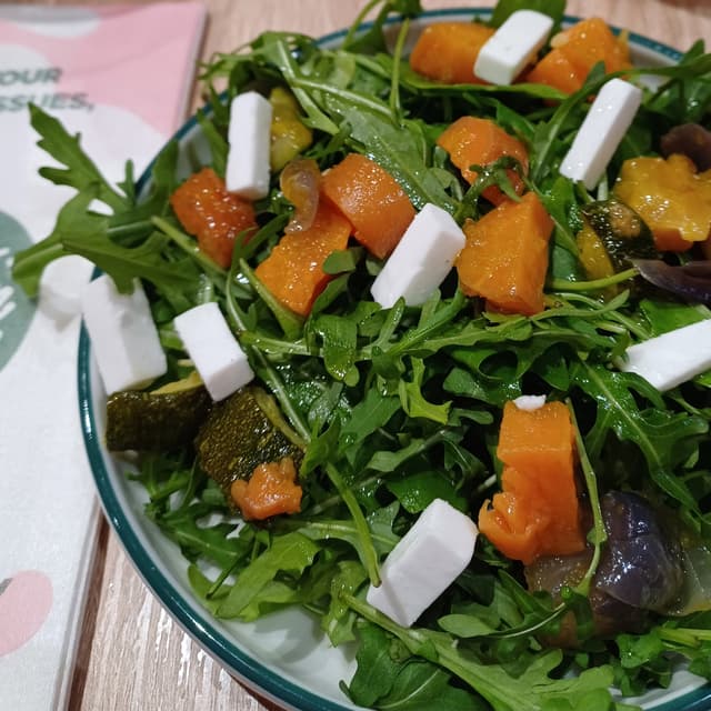 Per controbilanciare l'hamburgeroneDouble Bacon mio marito invece di orendere patatine o altri fritti ha optato oer una piccola salad. La composizione varia in base alla stagionalità. La base è di rucola e ci sono sempre dei pezzettini di feta vegan (non molto saporita ma gradevole). Oggi c'erano anche carote, zucchine e zucca.