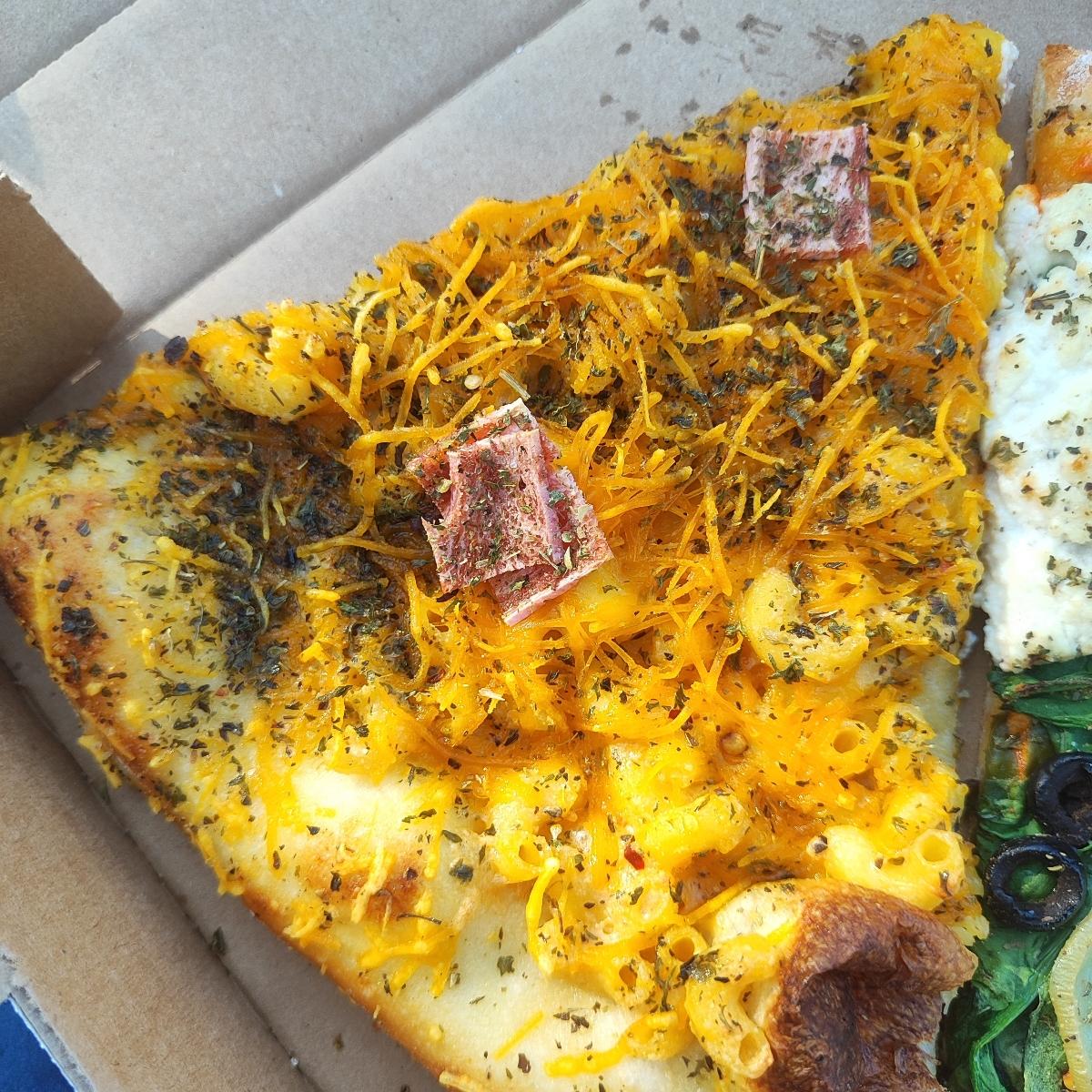 I had to try this! One of the slices on offer here this day at this completely plant based pizzeria. I never had #macncheez on a pizza before. This one has a white garlic base, mac 'n cheeze, chedd, and Canadian bac'n. It was delicious, a #carbivore delight for sure ! Not my fav that I tried but fun to try and super tasty! Slices are $5.50.