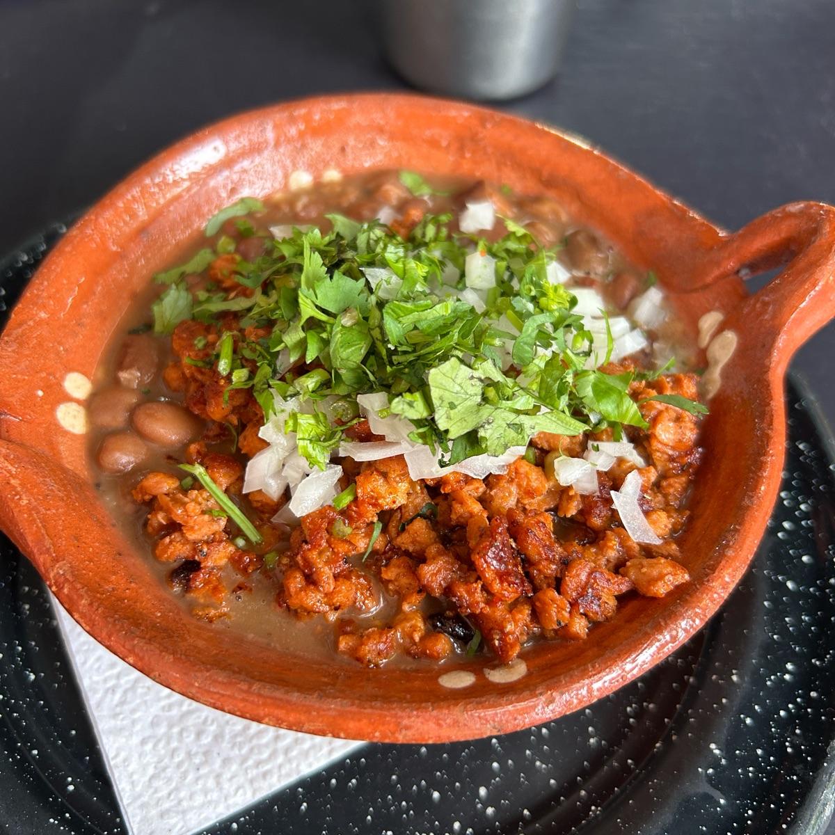 Loved these slow cooked beans 🫘 with spicy soy chorizo. These are topped with onions and cilantro. Great as an appetizer!