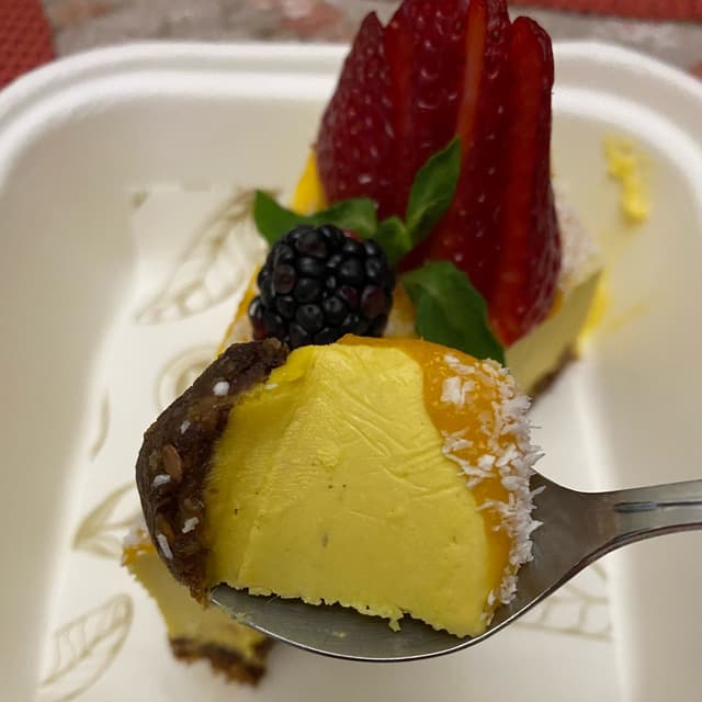 La combinación del mango y maracuyá es realmente delicioso. Super recomendado. Uno de mis postres favoritos de este lugar. #veganisnotscary #cheesecake #mango