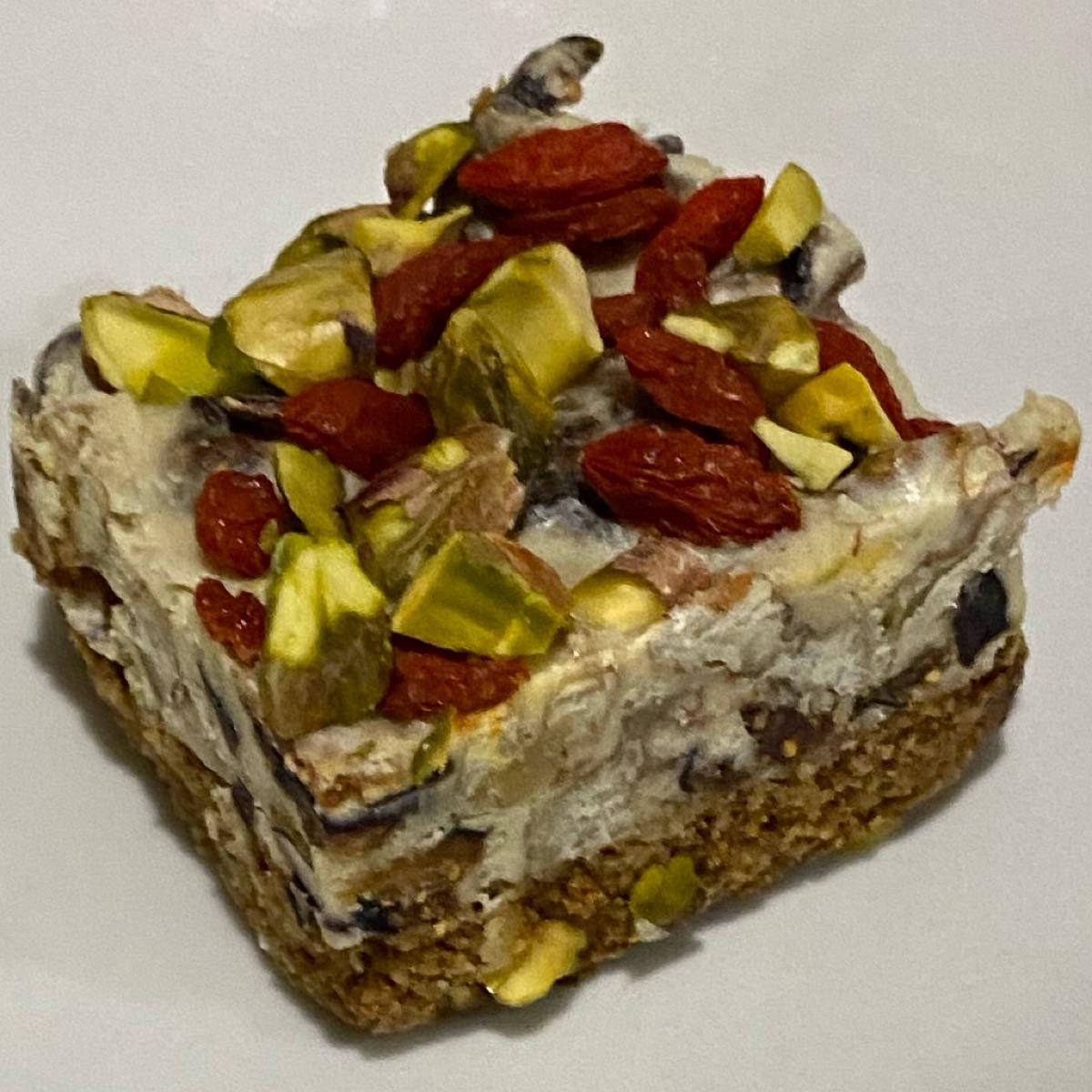 Walnut biscuit base and vegan white chocolate and fig are topped with goji berries and pistachios