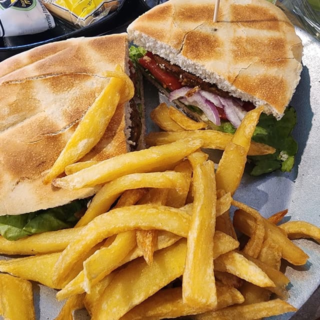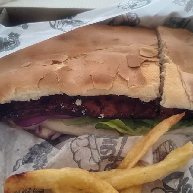 Bastante bien el seitan en cuanto a sabor, pero podría ser un poco más grueso. El pan que nos tocó estaba un poco seco. Podrían venir más papas.