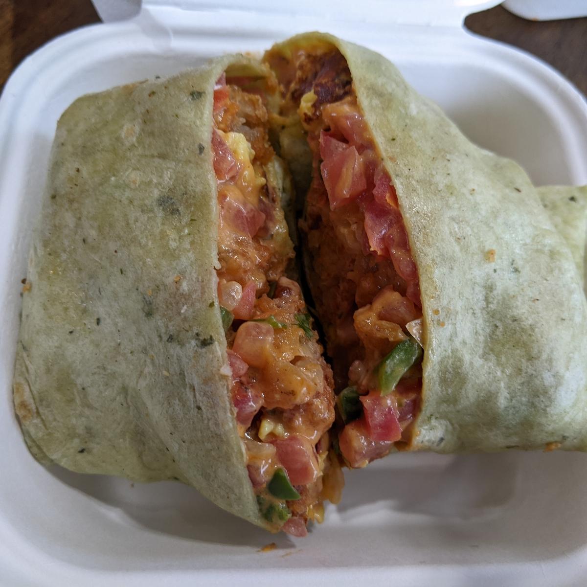 Loaded with flavor! Has a spicy sauce with Just Egg, Papas, pico and chin'n