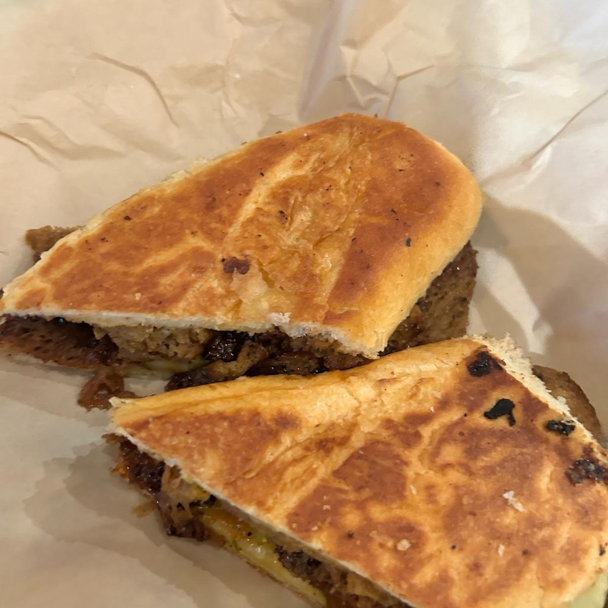 Wow! I was blown away by this sandwhich. It has marinated seitan, pickles, monterey jack "cheese", and mustard. The seitan was cooked wonderfully, very flavorful and a great texture. The pickles complimented the sandwhich wonderfully. Would definitely recommend.