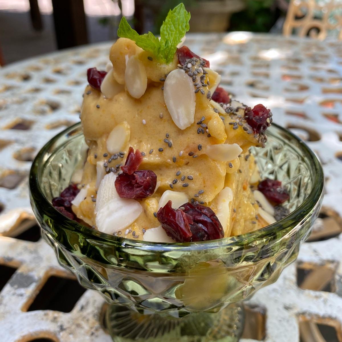 I adore The Node at Oaks on Main! It’s always a pleasure sitting under the trees and trying to spot the chameleons. Today I enjoyed this lovely smoothie bowl/nice cream and it was the perfect treat on a hot day. I chose cranberries, chia seeds, and almond flakes as my toppings.