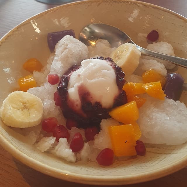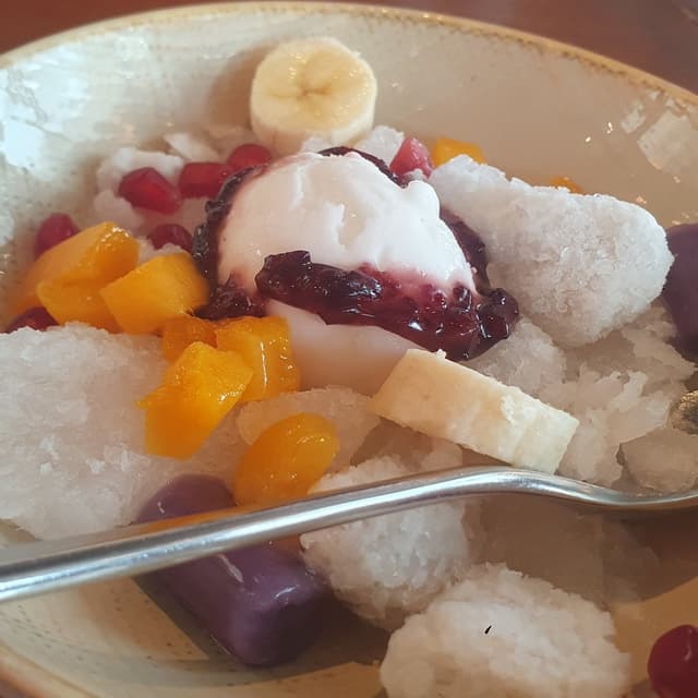 A superlative dessert, at the end of a very satisfying set lunch, the chairman's bubur cha cha is delectable, with a vegan #icecream at the center of a bunch of fruits... bananas, mangoes, pomegranates and taro swimming in #coconutmilk