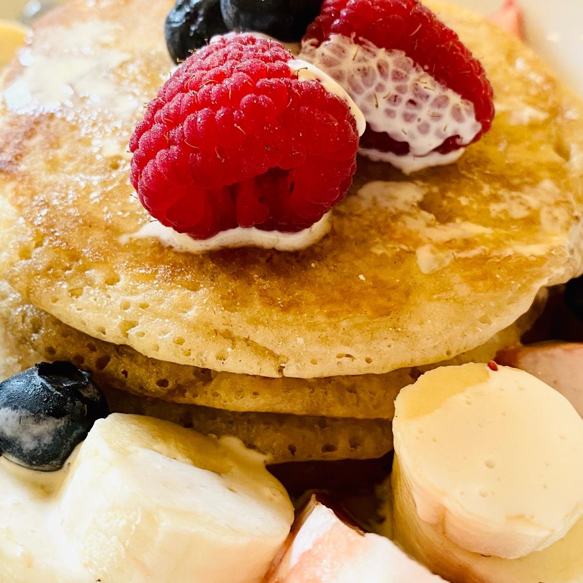 Incredible stack of pancakes and fresh fruit and a delicious serving of maple syrup. The pancakes were soft and fluffy with the perfect balance of flavours.