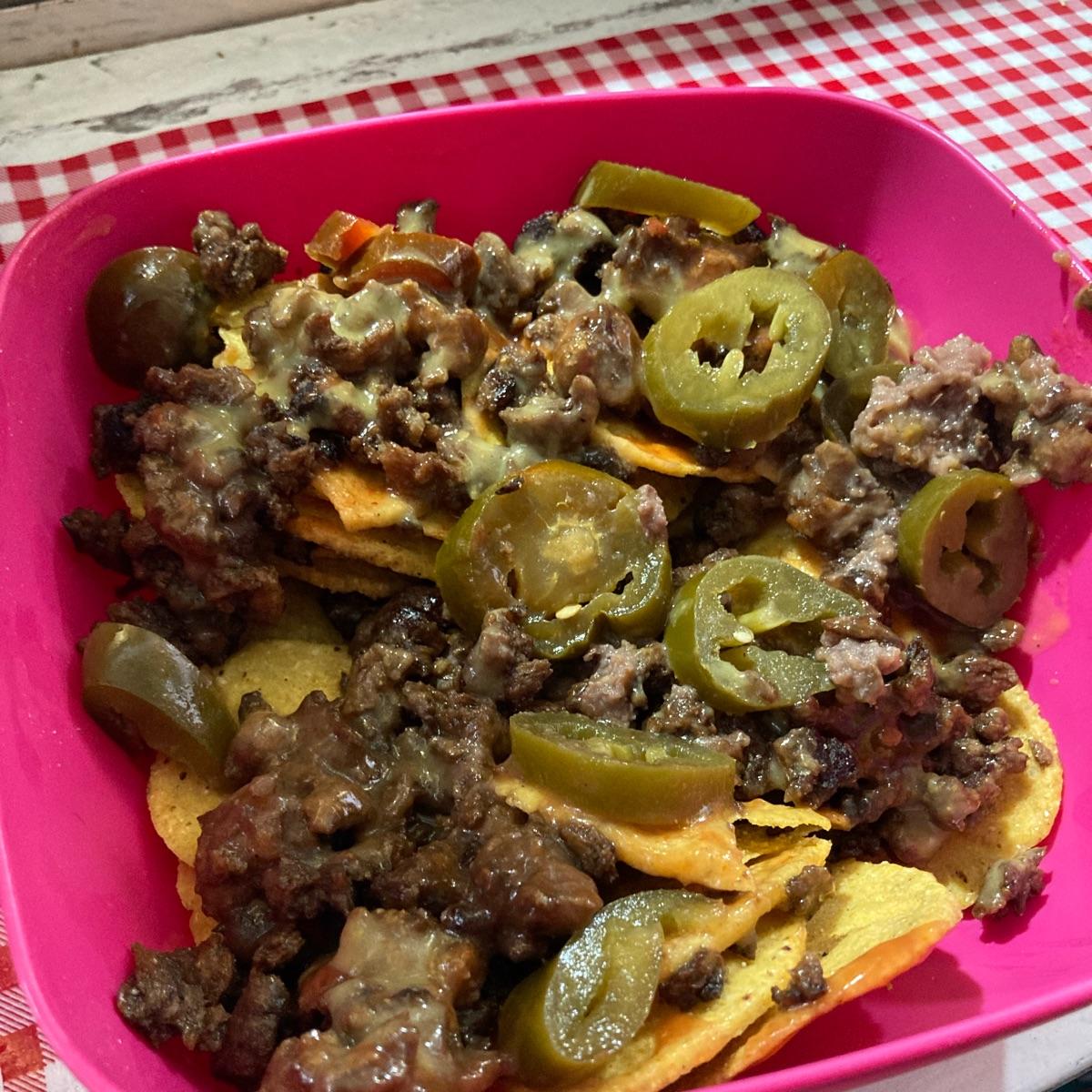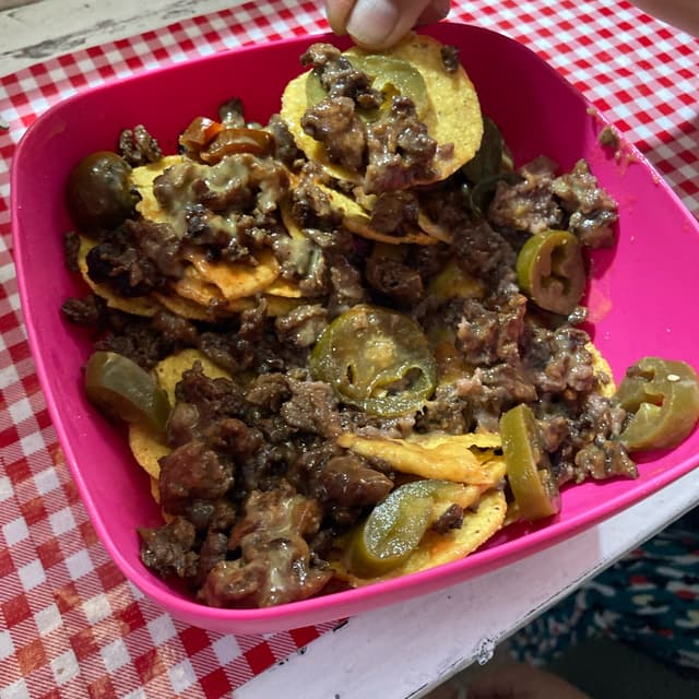 Nachos con queso vegano y chilli de soya, bastante rico, económico, lo recomiendo para compartir.