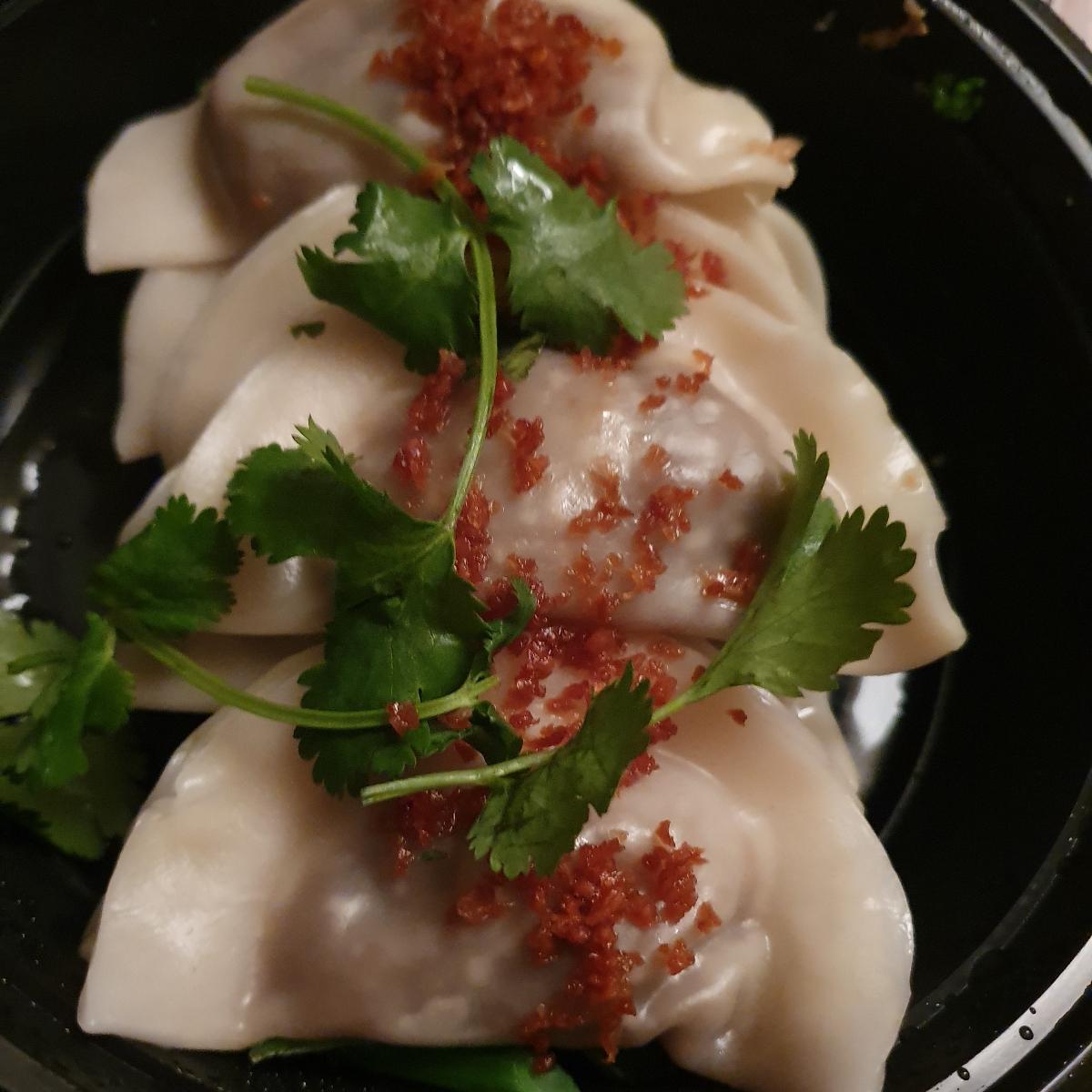 Very delicious and satisfying soup with king oyster mushroom wonton, yu choy, fried garlic, cilantro, vegetable consommé #veganisnotscary #veganin2023