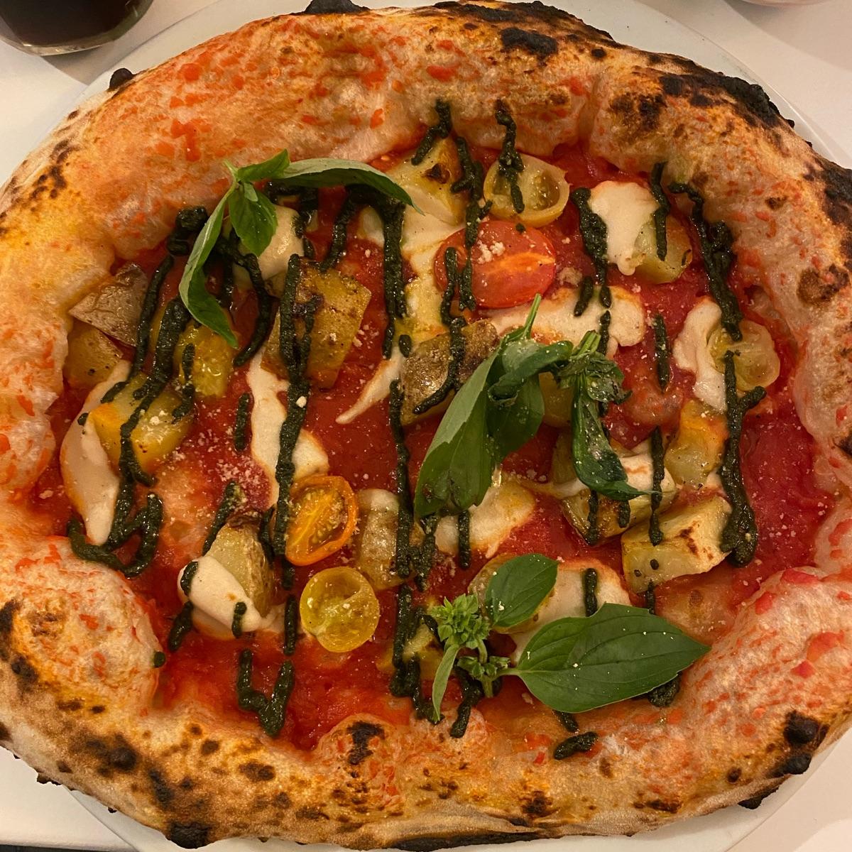 Ho preso questa pizza con pomodorini gialli e rossi, grana veg, basilico e al posto delle melanzane ho chiesto di mettere delle patate al forno. Molto buona 🥰