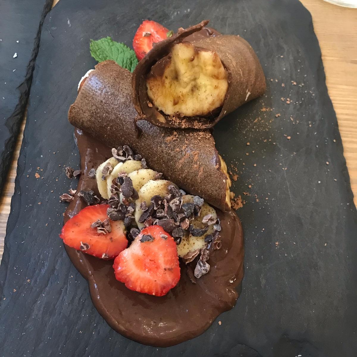 Lovely chocolately crepey goodness with some nice strawberries, bananas and mint to accompany. They were a little tough to cut through but taste great all the same.