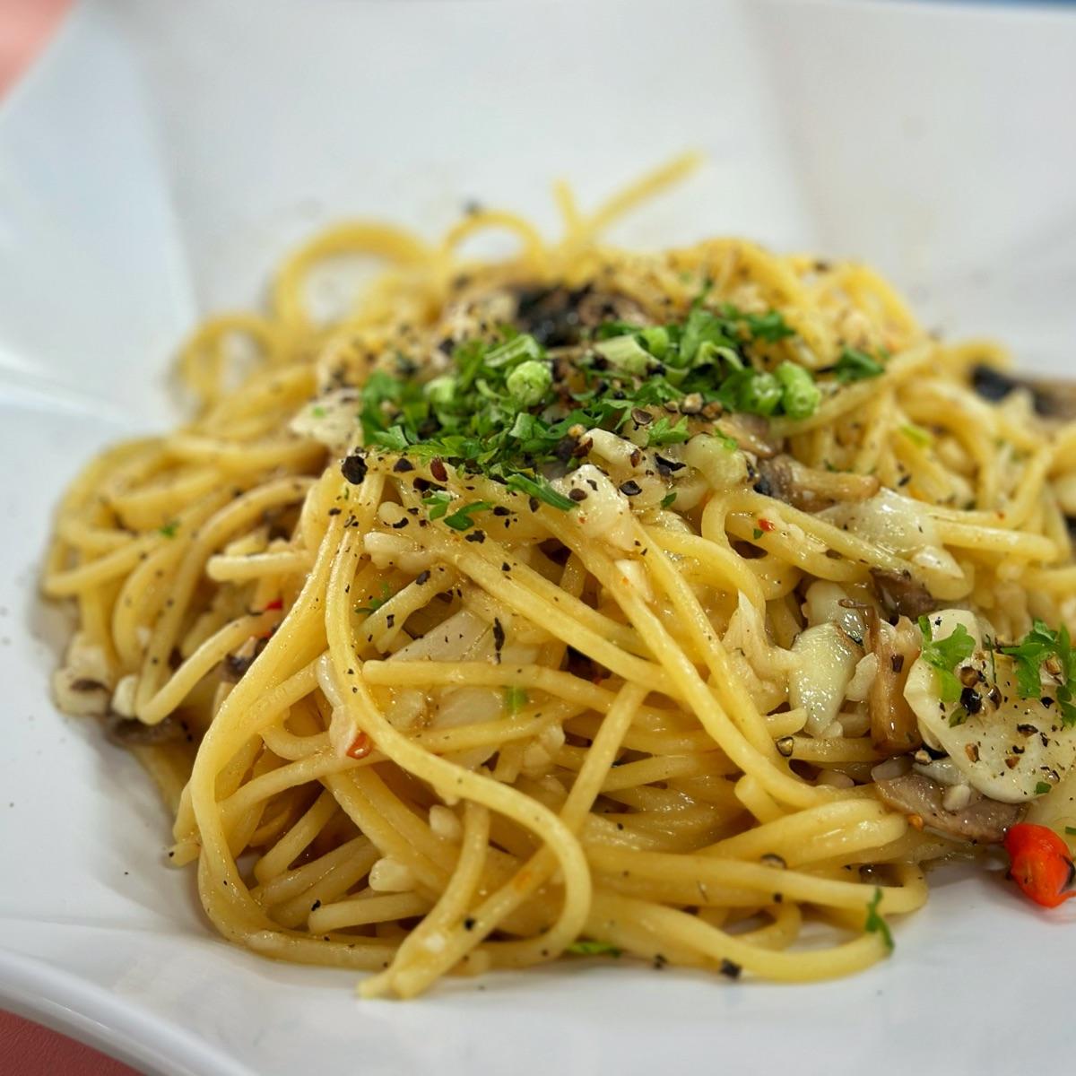 Beach Road Food Centre is pretty notoriously vegan unfriendly but this is aglio olio is a gem. A naturally vegan dish for only 6 dollars that is very well done, where many non vegans have claimed the star of the meal the pasta and not the meat protien, which are optional. Truly one of the best aglio I've ever had, the garlic is strong but not bitter at all. I chose to zing up my aglio olio with a $1 mushroom top up. Perfect with the OATLA fresh oat milk in the same food centre ❤️