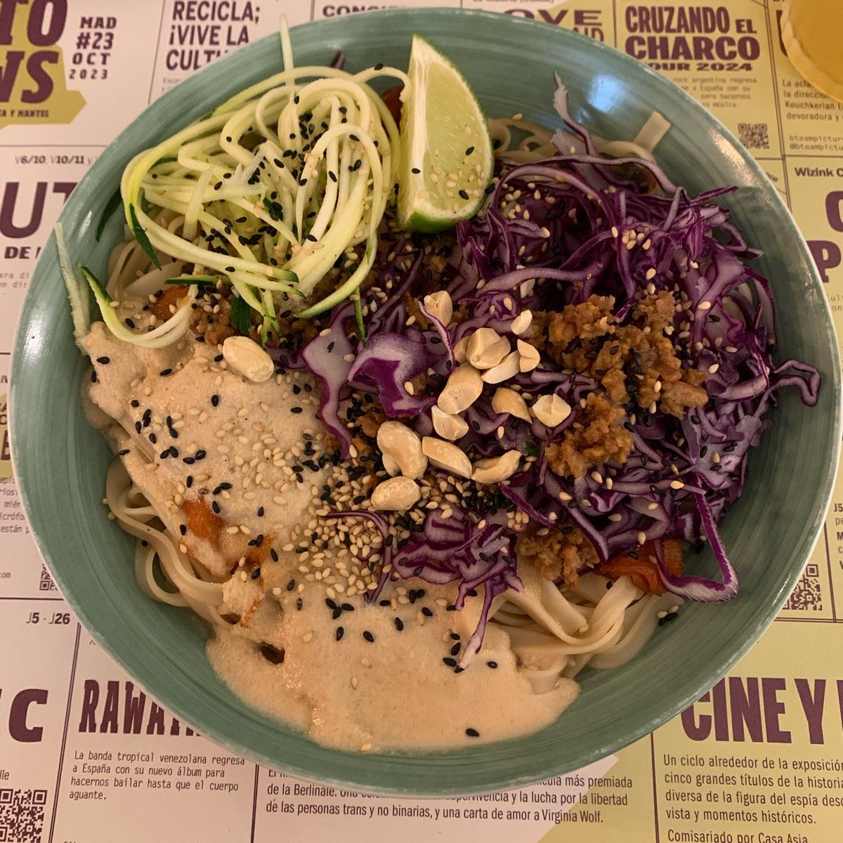 Fideos de arroz con verduras asadas, lombarda, tempeh salteado y salsa de cacahué, sésamo negro y lima. #vegan #veganisnotscary está muy rico