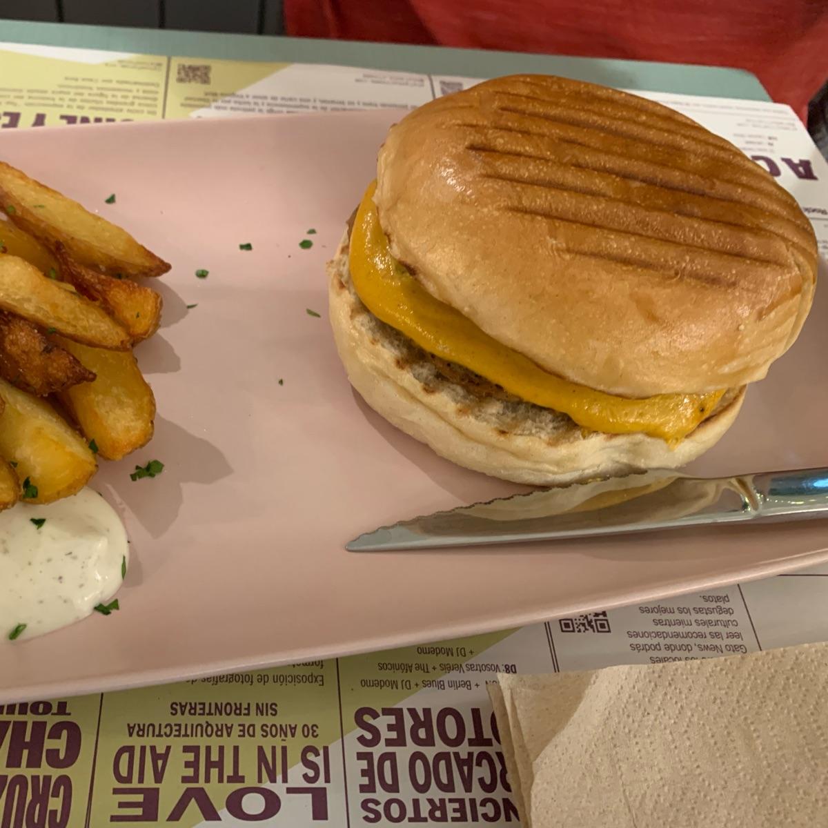 burger de soja con champiñones, "bacon", crema de "queso cheddar" de anacardos y pepinillos. #vegan #veganisnotscary está buena