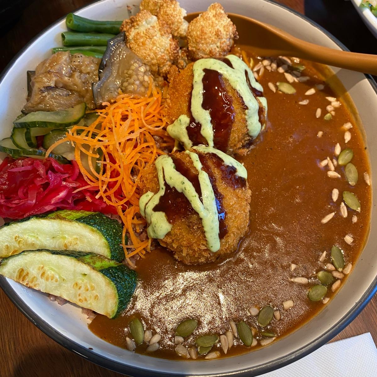This Japanese curry was amazing especially the croquettes (only two though). Served with roasted veggies, pickles, brown and black rice (looks more like purple rice). New favourite 😍