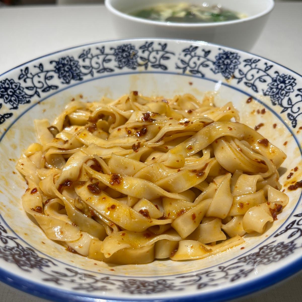 This bowl of chewy flat noodles mixed with chilli and fried “anchovies” was comfort food for me. Came with a bowl of hot soup that had spinach, mushrooms, black fungus and tofu in it. Eggs in the soup can be excluded on request. #banmian #fettucine #vegannoodles