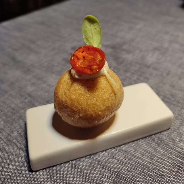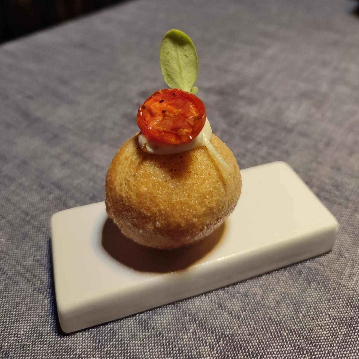 La nostra cena, o meglio definirla esperienza, in questo ristorante di alta cucina è cominciata con questo entrée: è un bocconcino di pasta fritta con una goccia di crema di anacardi fermentati e un pomodorino confit. Molto buona, soprattutto per il formaggino e il pomodoro confit farti a regola d'arte. Io non amo i fritti ma ho trovato il bocconcino goloso e delicato.