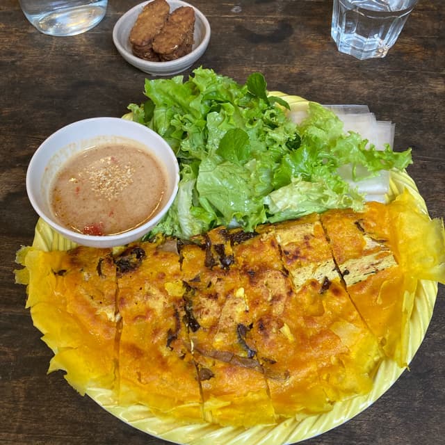 Vegan Bánh xèo! This savory pancake is filled with mushrooms, tofu and soy sprouts, served with fresh herbs and salad greens, a dipping sauce and rice paper. I included a small guide on how to eat it: take rice paper, put in the veggies, add the pancake, roll, dip, enjoy! #vietnamese #banhxeo
