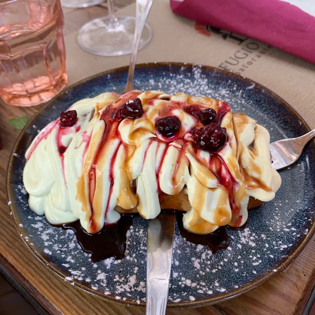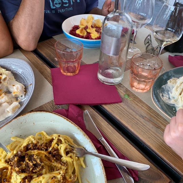 Abbiamo provato l’antipasto del rifugio, i moscardini, la carbonara, la cacio e pepe e infine il babà alla crema. Tutto strepitoso, ma la carbonara è qualcosa di fantastico!