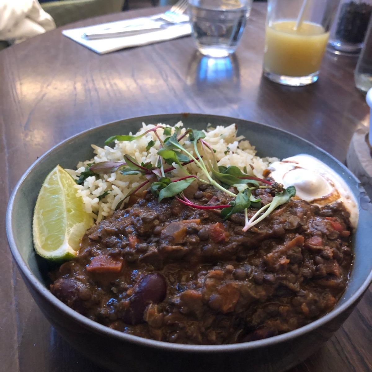 Smoky chilli of spiced mushrooms, lentils, and kidney beans on basmati herb rice with cashew sour cream, lime, & coriander cress