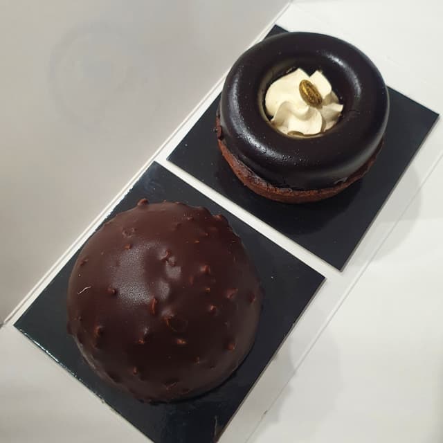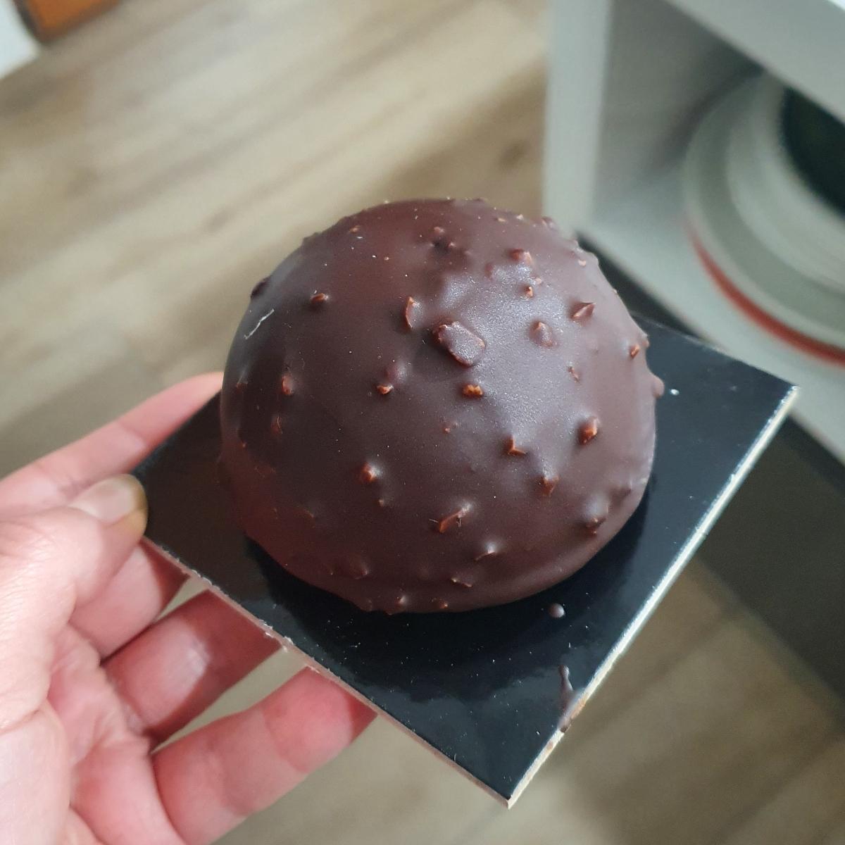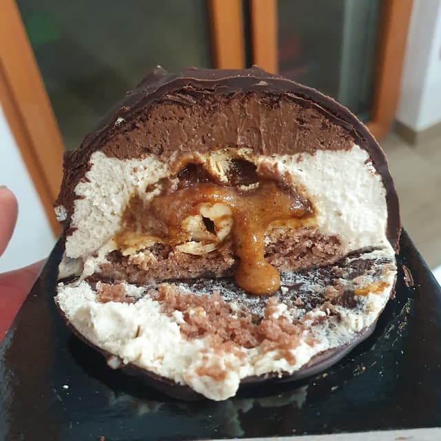 Oggi mio padre è venuto a casa con sei dolcetti diversi presi da Vegan Art, non poteva farmi più felice. Adesso li recensisco uno ad uno, questo è il secondo che pubblico. Non so di preciso il nome e gli ingredienti, ma fidatevi che è golosissimo. La parte al centro, che io pensavo fosse caramello, è invece crema alla nocciola, poi c'è della panna (?) e del cioccolato e una piccola parte di pan di Spagna morbidissimo, il tutto è coperto da questa mezza sfera di cioccolato fondente con granella di nocciole. Scusatemi, non me ne intendo di dolci, preferisco il salato, la mia descrizione sarà molto imprecisa, ma la cosa più importante è che è buono 😂 Questo secondo me va condiviso perché è molto dolce, non c'è qualcosa che spezzi la dolcezza, per cui disgusterebbe un po' mangiarlo tutto, però ovviamente dipende dalla persona che lo prende.