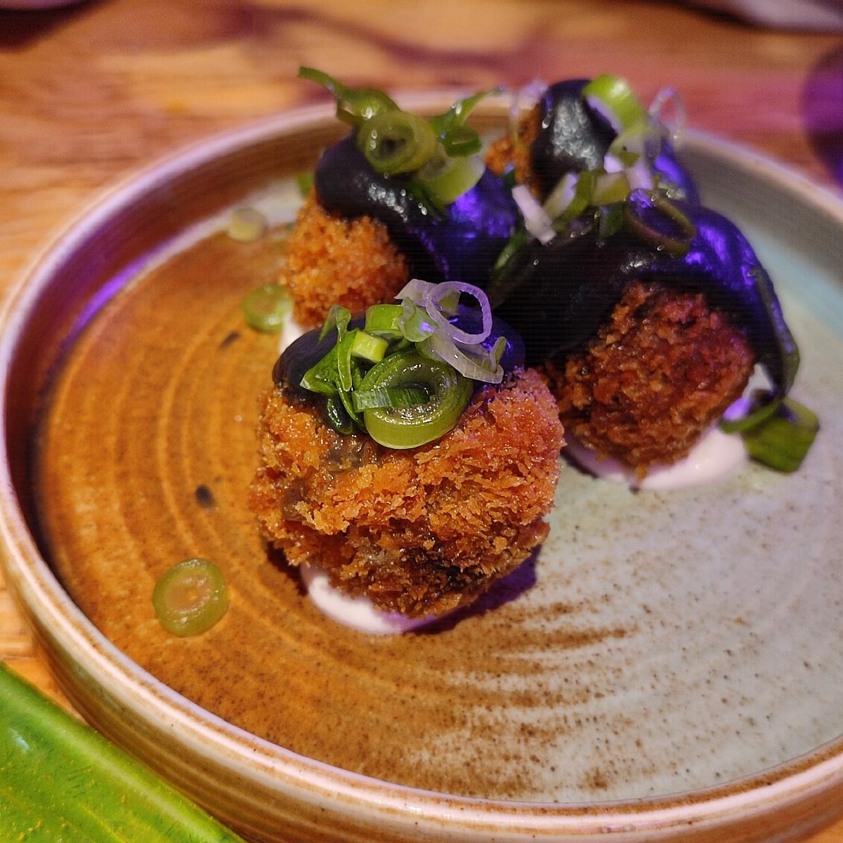 Croquetas de arroz con berenjena “Yu-Xiang”, acompañadas por una salsa a base de berenjena. Por 8,00 €