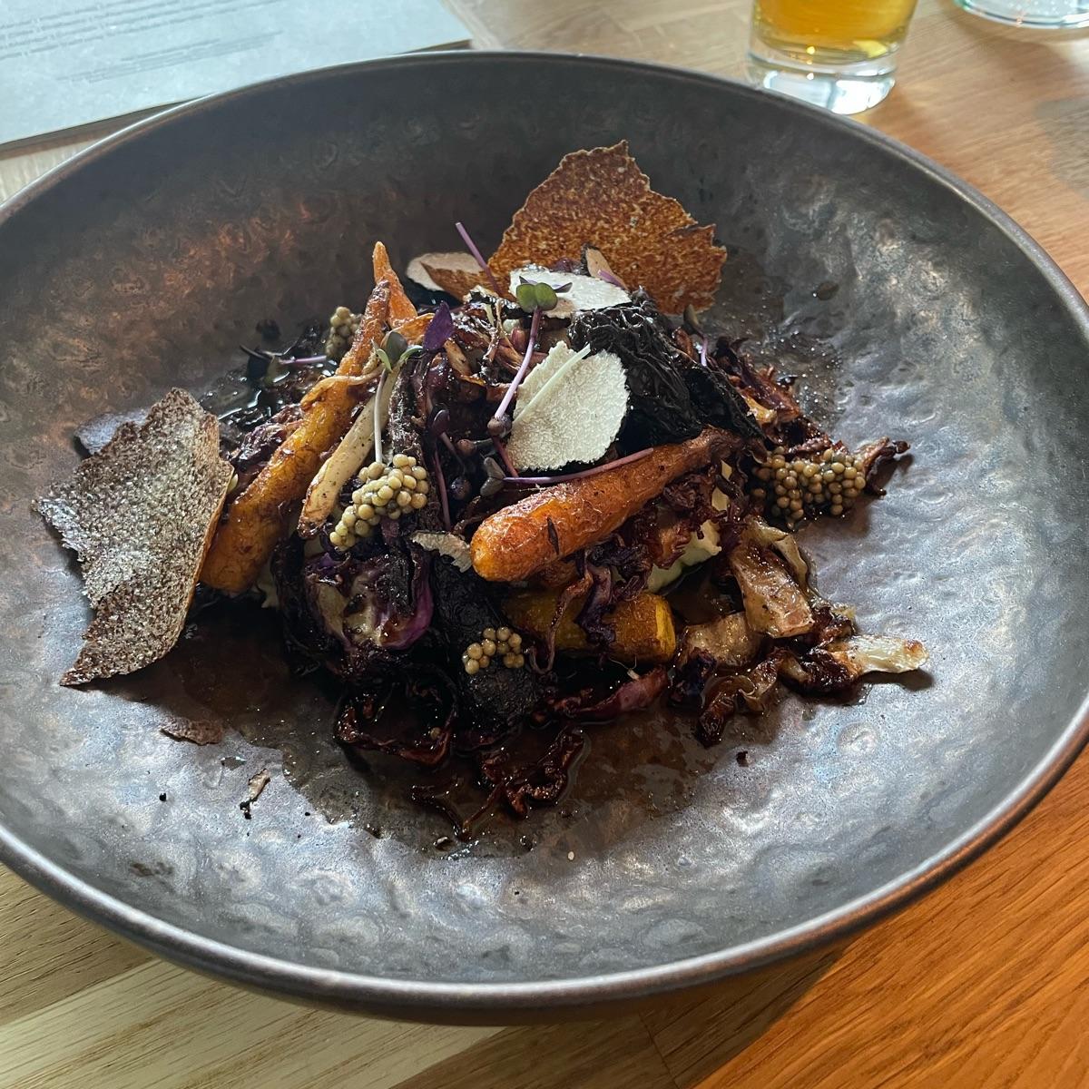Maybe the best dish we tried that evening but everything #jonathangebhardt creates is outstanding 🤩 This is roasted cabbage, mushroom jus, carrots, hazelnuts on top of mashed potatoes with truffle 😋 - 23€