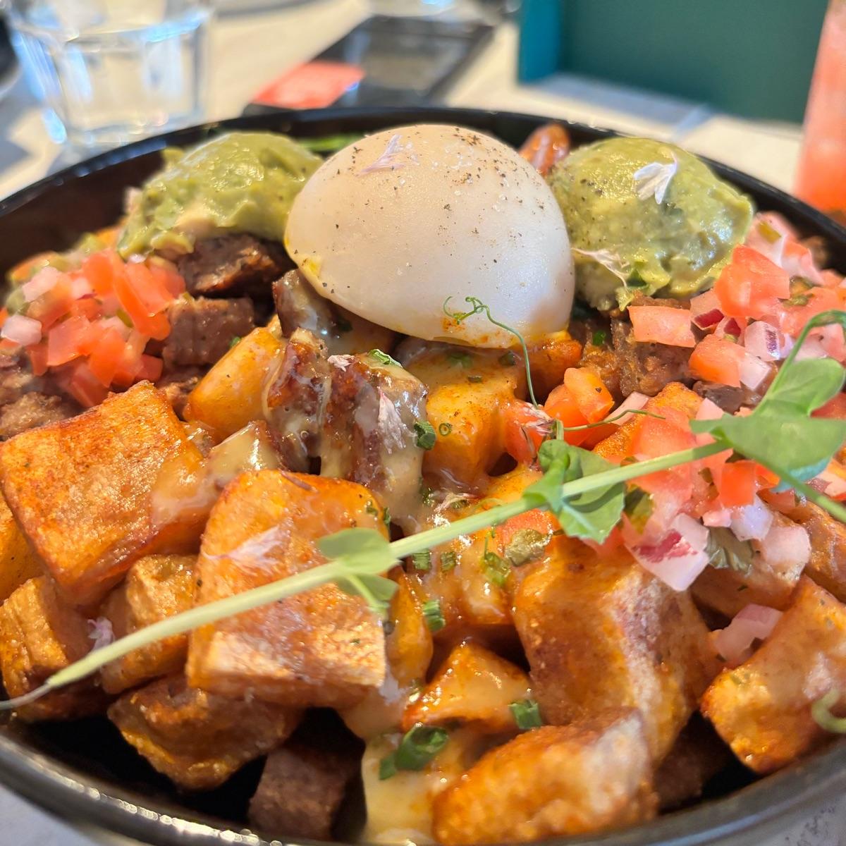 This is the loaded version of the breakfast poutine at Astoria in Gatineau ; comes with a poached Yo egg, vegan sausage, guacamole and cheese ! Omg sooo good I absolutely recommend it