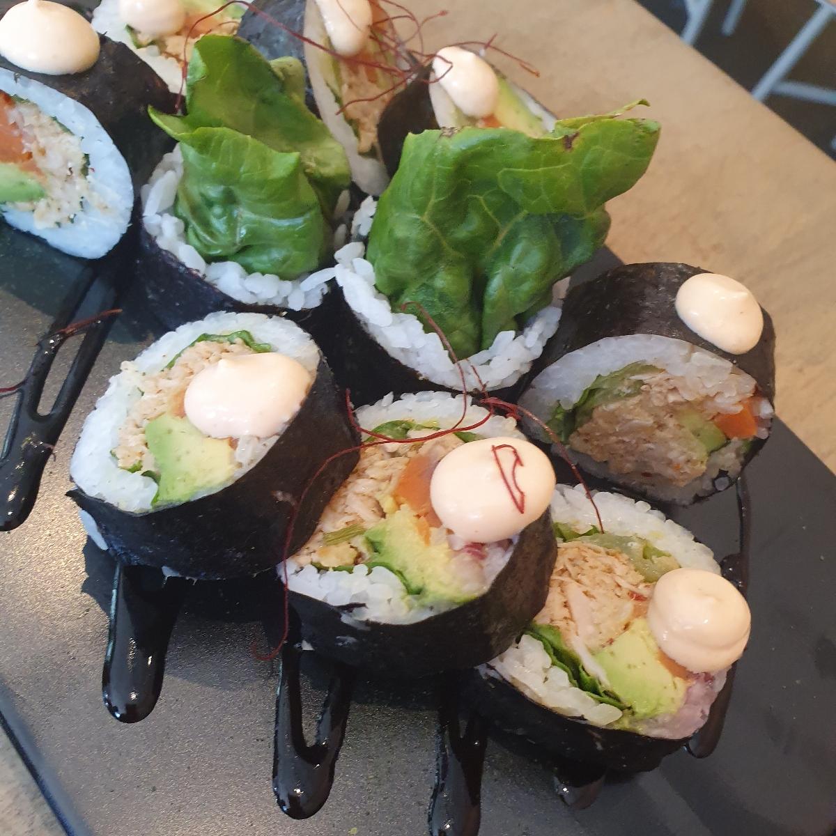 This #spicy #jackfruit crab roll was delicious. It has white rice, lettuce, spicy Jackfruit crab, pickled red onions, marinated carrots, avocado, chili strands, ponzo, toasted cayenne sauce