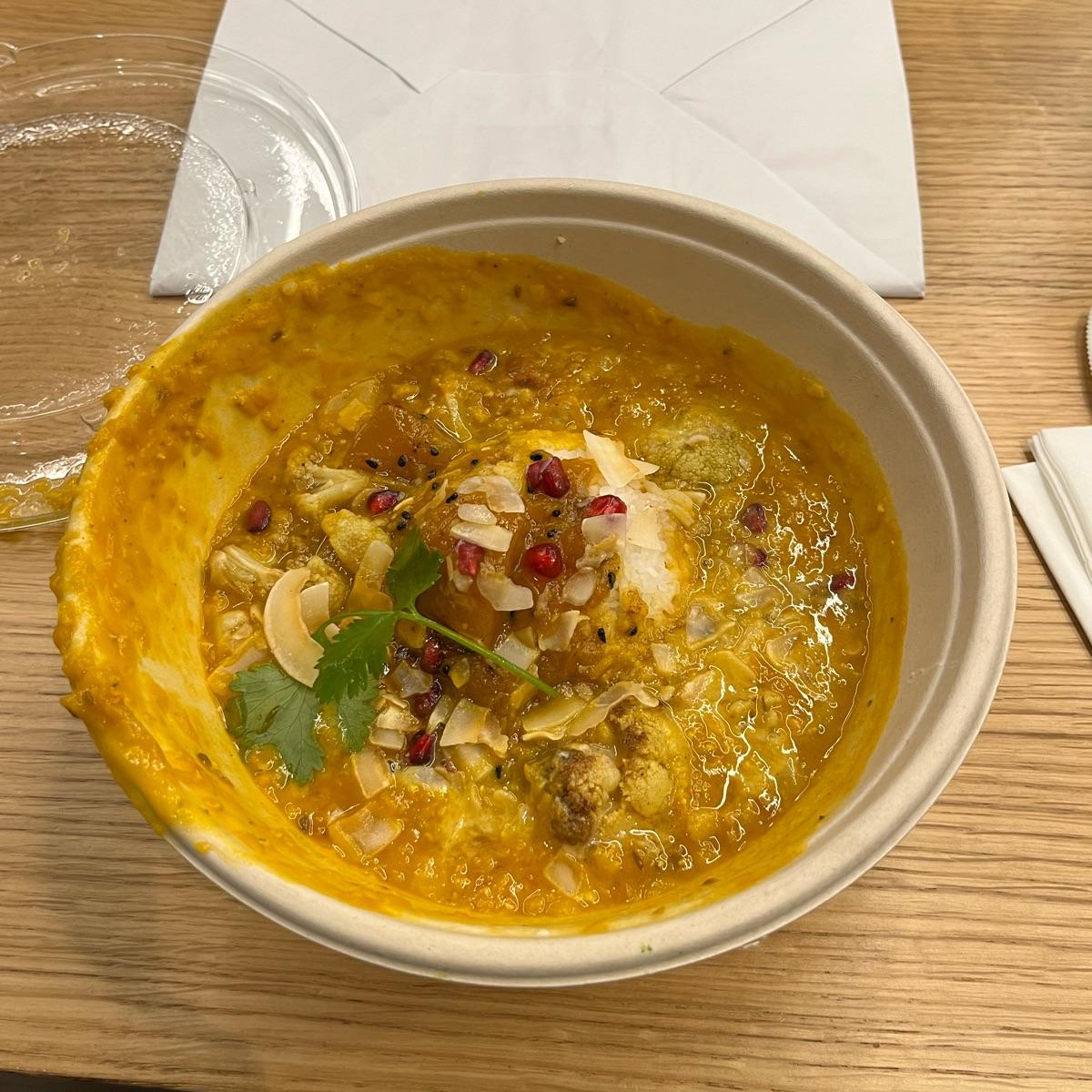 Unfortunately this pic doesn’t do the dish justice, because it looks a little bit messy in the take-out bowl. But this daal bowl is not only delicious but beautifully presented too. The main ingredients are red lentils, cauliflower, a rhubarb mango chutney and coconut milk. It’s so rich and flavorful, it makes for a very satisfying meal.