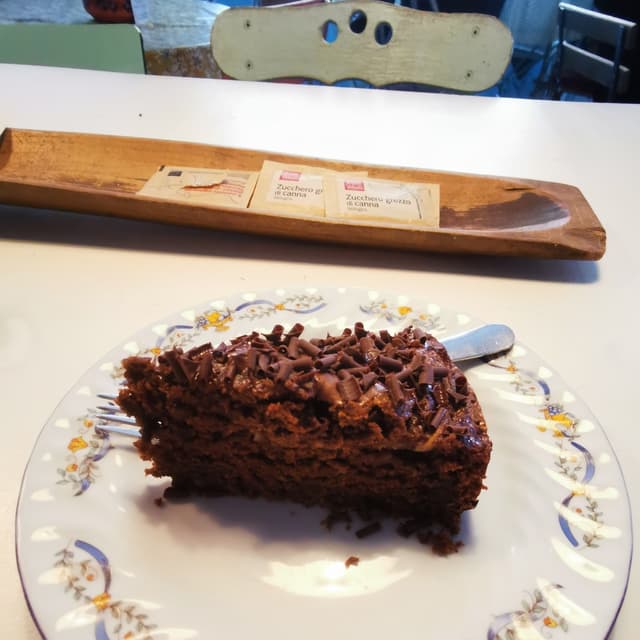 Una soddisfacente fetta di torta al cacao con generose scaglie di fondente sia in superficie sia nell'impasto. La consistenza è un po' "mappazosa", ma si fa mangiare, soprattutto grazie al fatto che viene servita scaldata. #glutenfree #senzaglutine